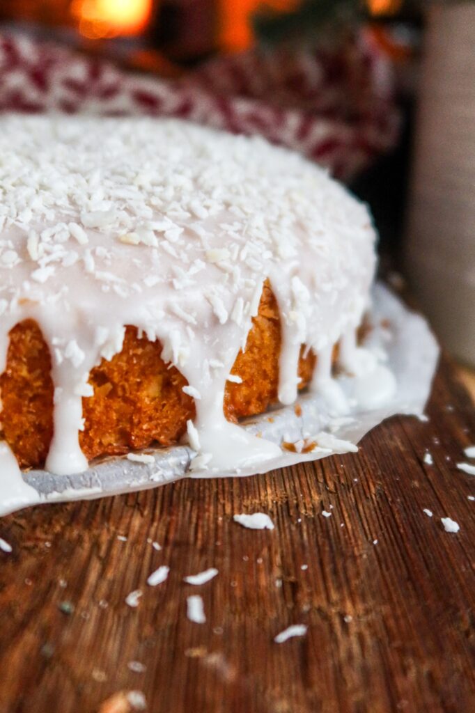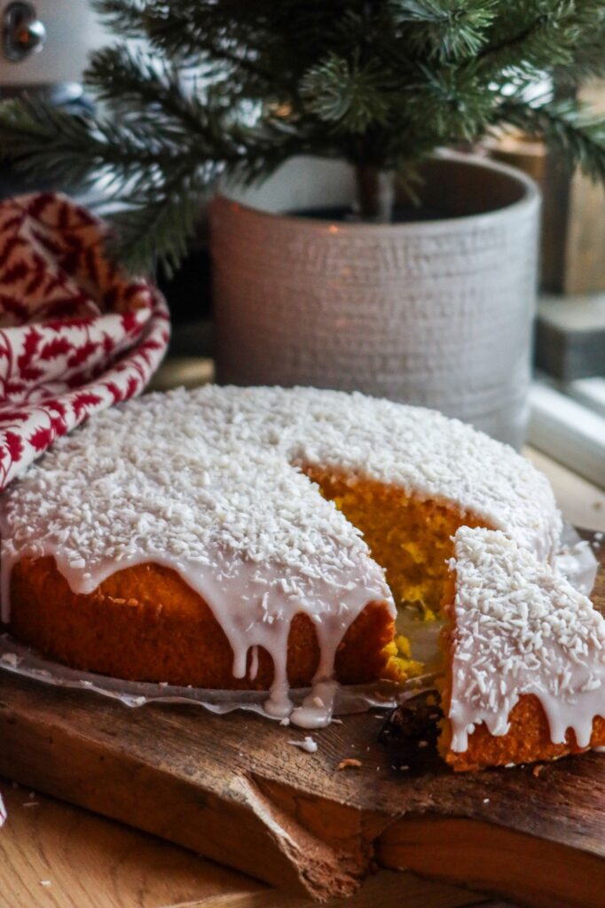 - När kakan har svalnat, bred på glasyren över kakan strö på kokosflingor och låt den stelna lite innan du serverar.
