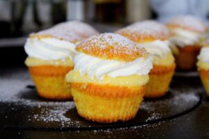 6) Låt muffinsen svalna helt. Skär av toppen på muffinsen och fyll sedan med vaniljkräm och vispad grädde. ÄT OCH NJUT!