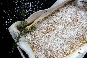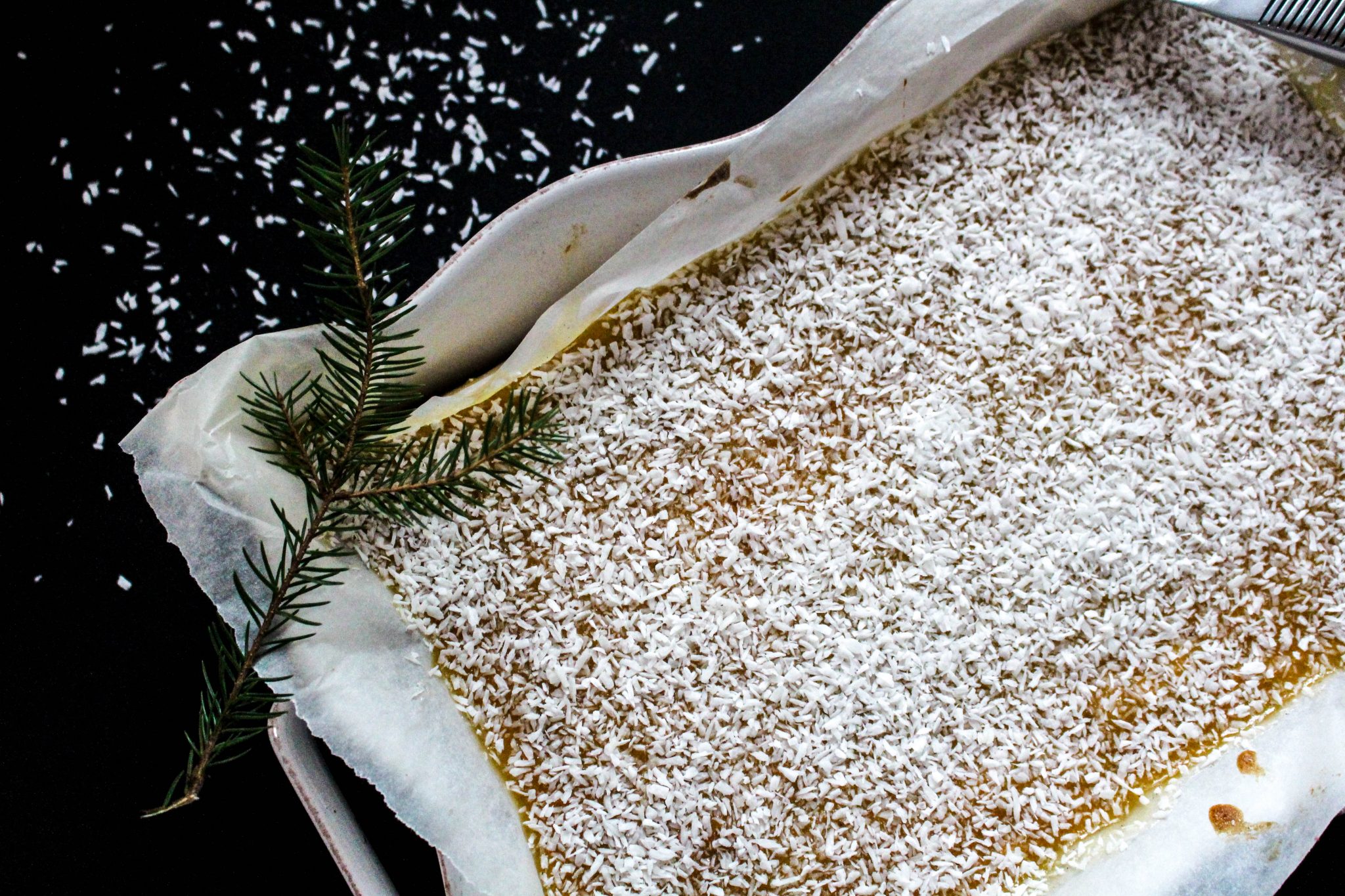 6) Häll på glasyren på kakan när den svalnat helt, bred ut den över hela. Toppa med kokosflingor.