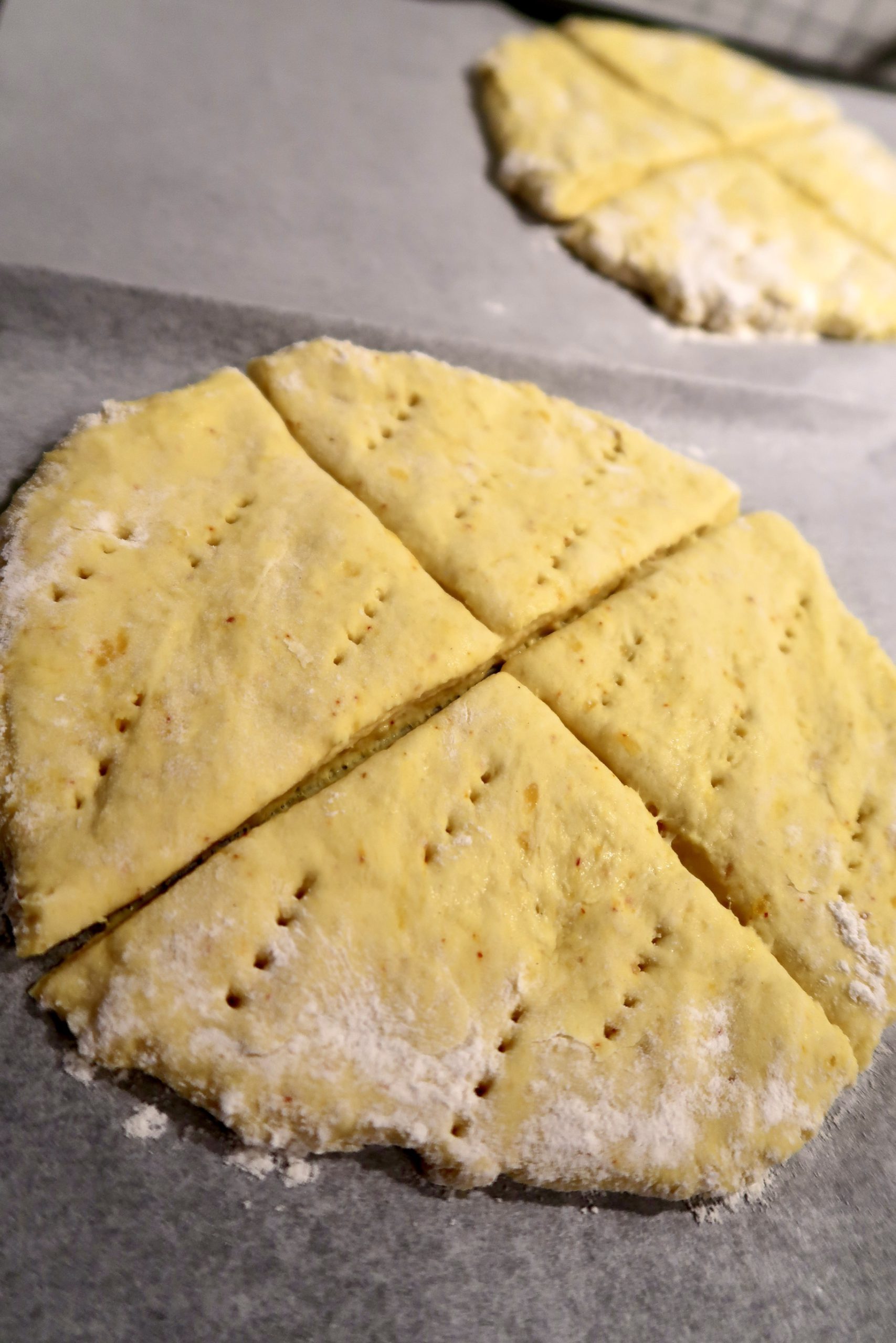 4) Ta fram ugnsplåtar, lägg på bakplåtspapper. Klicka ut 2 stora högar på varje plåt. Pudra mjöl över högarna och tryck ut till plattor. Dela dem i 4 och nagga varje.