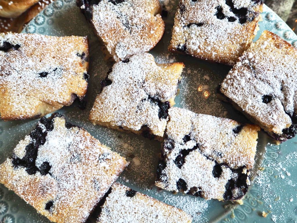 5) Klä en långpanna (ca 25×35 cm) med bakplåtspapper. Häll i hälften av smeten, sedan hälften av blåbären. Strö över hälften av rårörssockret också. Häll sedan på resten sv smeten, blåbären och rårörssockret. Grädda på 200 grader i ugnen i ca 20-25 min. Kakan ska vara helt torr rakt igenom. Pudra över florsocker och skär upp den i rutor.
