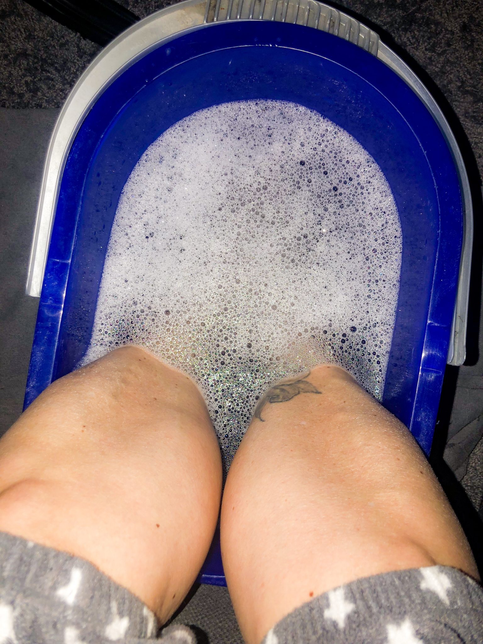 Det blev en hink istället för vårt riktiga fotbad. Vettitusan var den tagit vägen alltså? Vi har en sån med massagetjossanhejsan och allt, men den är borta. Ligger väl i en kartong längst in i förrådet. Orkar bara inte leta upp den nu, men måste nog sen då den är så jädrans skön och sitta i. Älskar det där burrandet under fötterna.