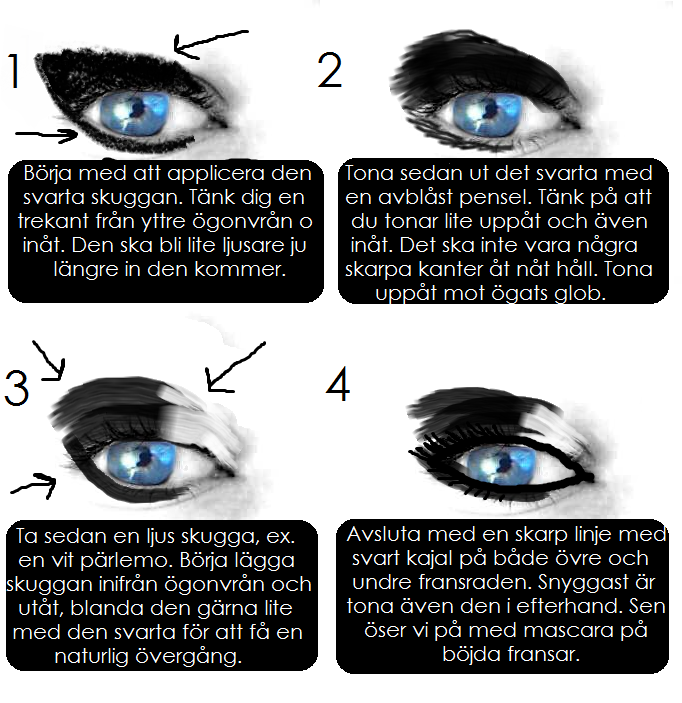 1) Först applicerar du självklart ditt underlag i hela ansiktet, concealer, underlagscreme och rubbet. Därefter brukar jag använda något slags fäste att ha under själva skuggan. Själv använder jag Make Up Stores HIGH TECH LIGHTER som fungerar lite som en cremeögonskugga men är väldigt neutral i färgen. Den brukar jag ha på väldigt tunt. Fäster GÖRBRA med skuggan sedan samtidigt som det är väldigt lättjobbat. Sist men inte minst så sitter det BENHÅRT hela kvällen. Smäll på med den svarta ögonskuggan som jag visat på bilden. Alla har olika ögonformer men denna brukar funka på de allra flesta. Tänk på att inte gå upp för högt med den svarta. Helst ska det svarta bara appliceras på ögonlockets rörliga del. Alltså höjer du ögonbrynet och du ser att det sitter skugga där har du gått lite för högt i detta skede.Applicera även tunt under den nedre fransraden.