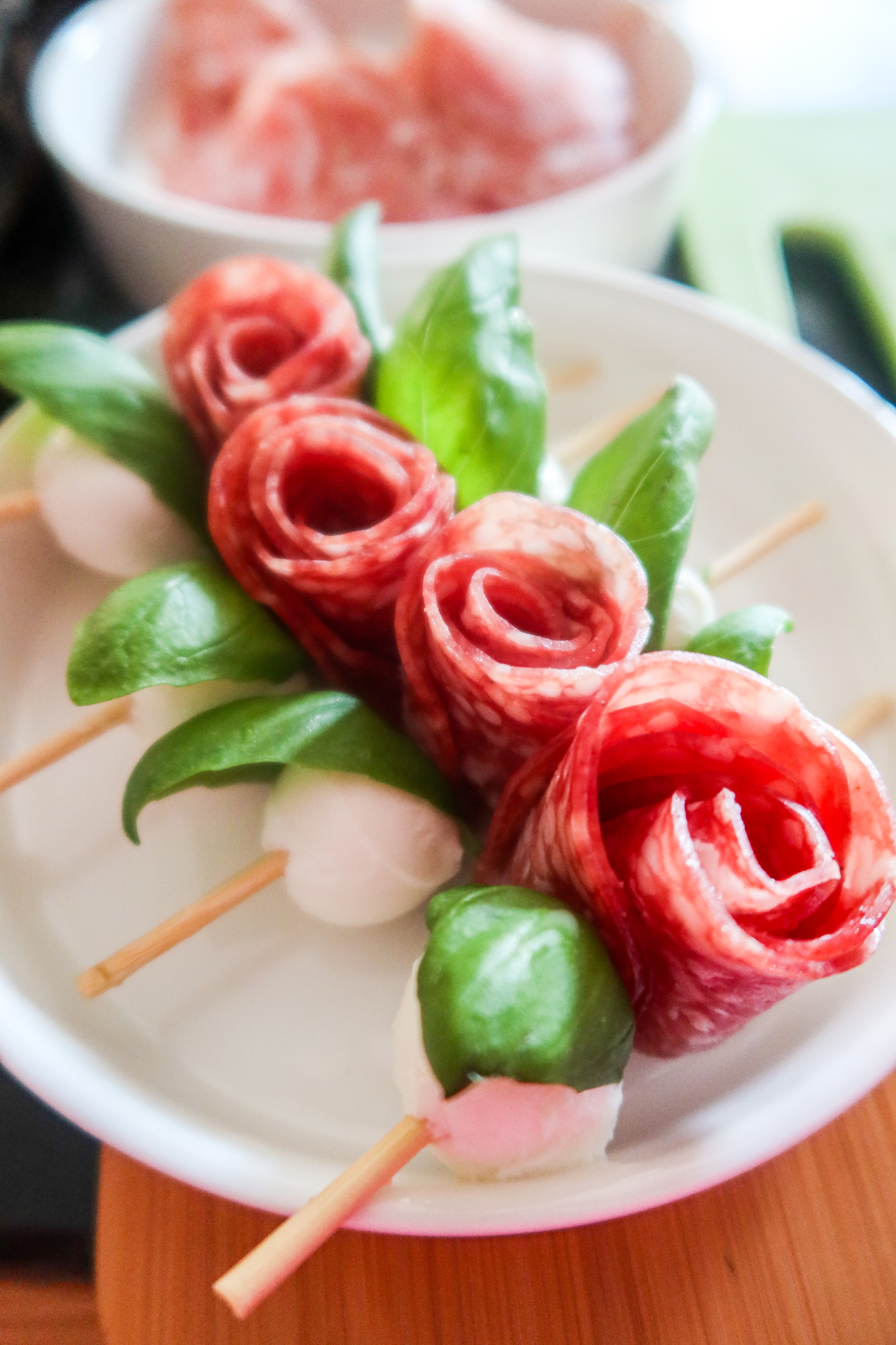 3) Ta fram bitar av grillspettspinnar, trä på mozzarella, ett basilikablad, salamirosen, basilikablad igen och avsluta med mozzarella.