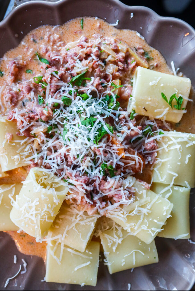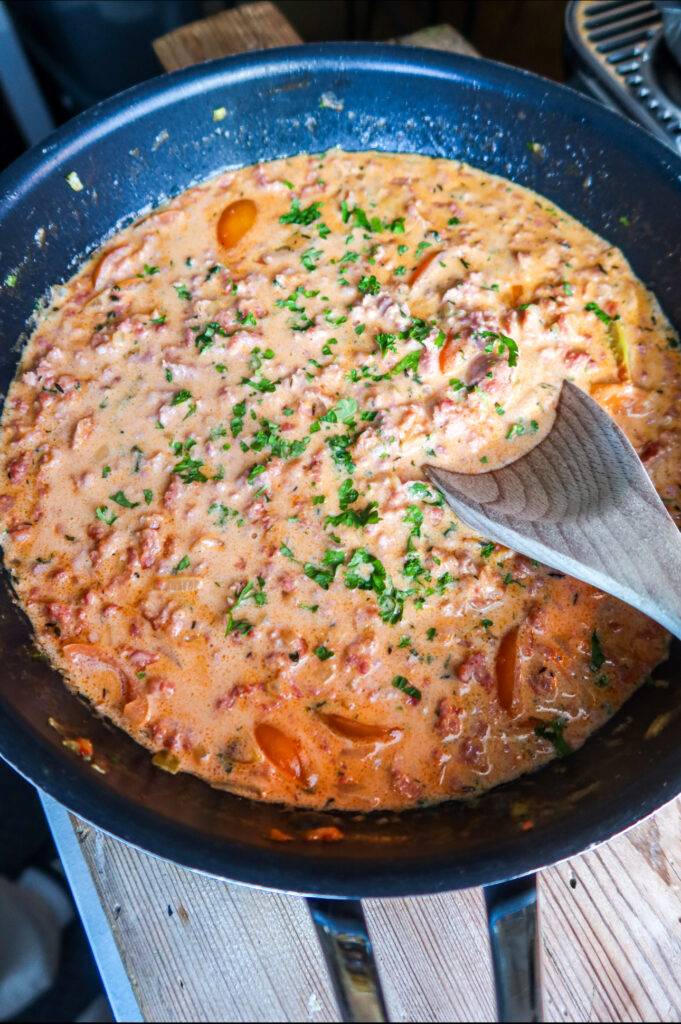 4. Koka pastan under tiden, häll gärna i den i salsicciaröran. Om inte så går det fint att servera var för sig. Toppa med färsk klippt persilja och riven parmesan.