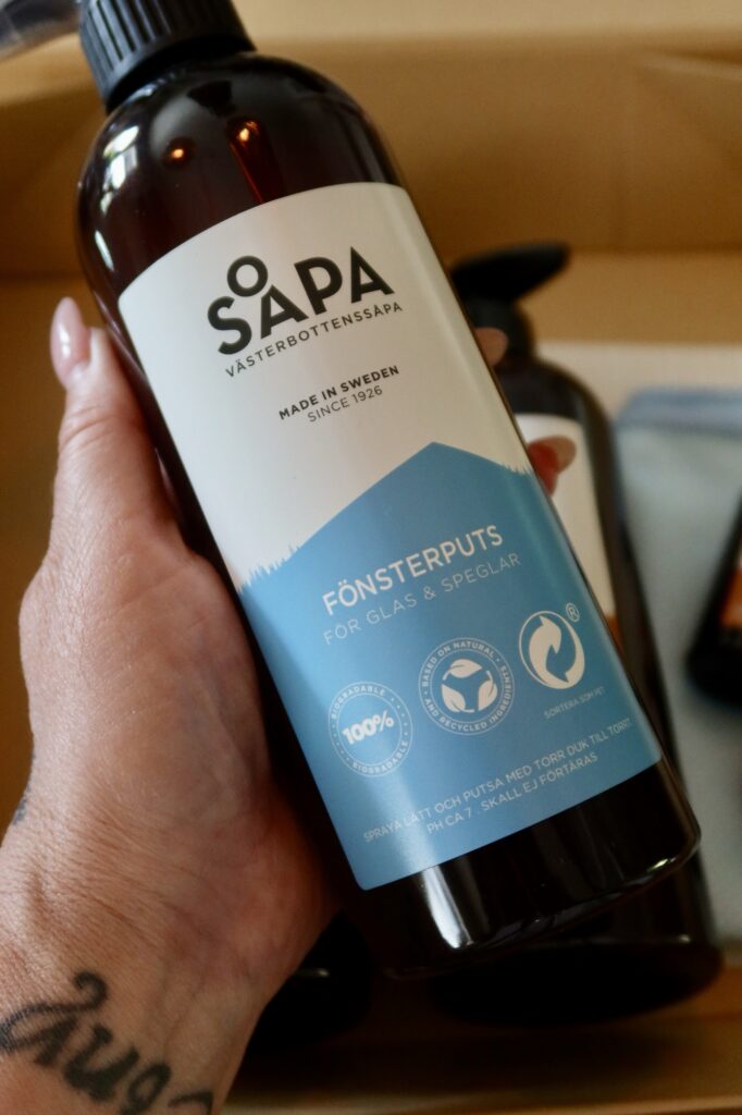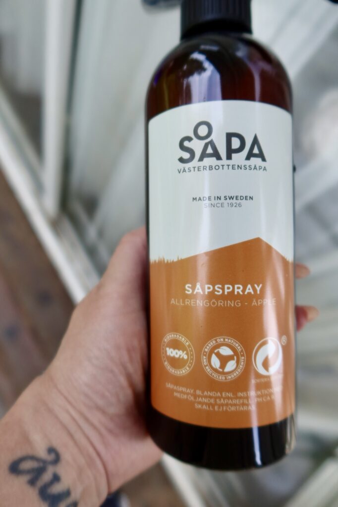 Till mina uterumsfönster använde jag ”Fönster + äppelkit” (<länk), där i hittar du den nya doften på såpa som är äpple, helt magisk. Världens bästa fönsterputs. Du hittar också disktrasa och min favorit, microfiberduken som ger de renaste fönster du kan tänka dig. Resultatet är smashing varje gång!