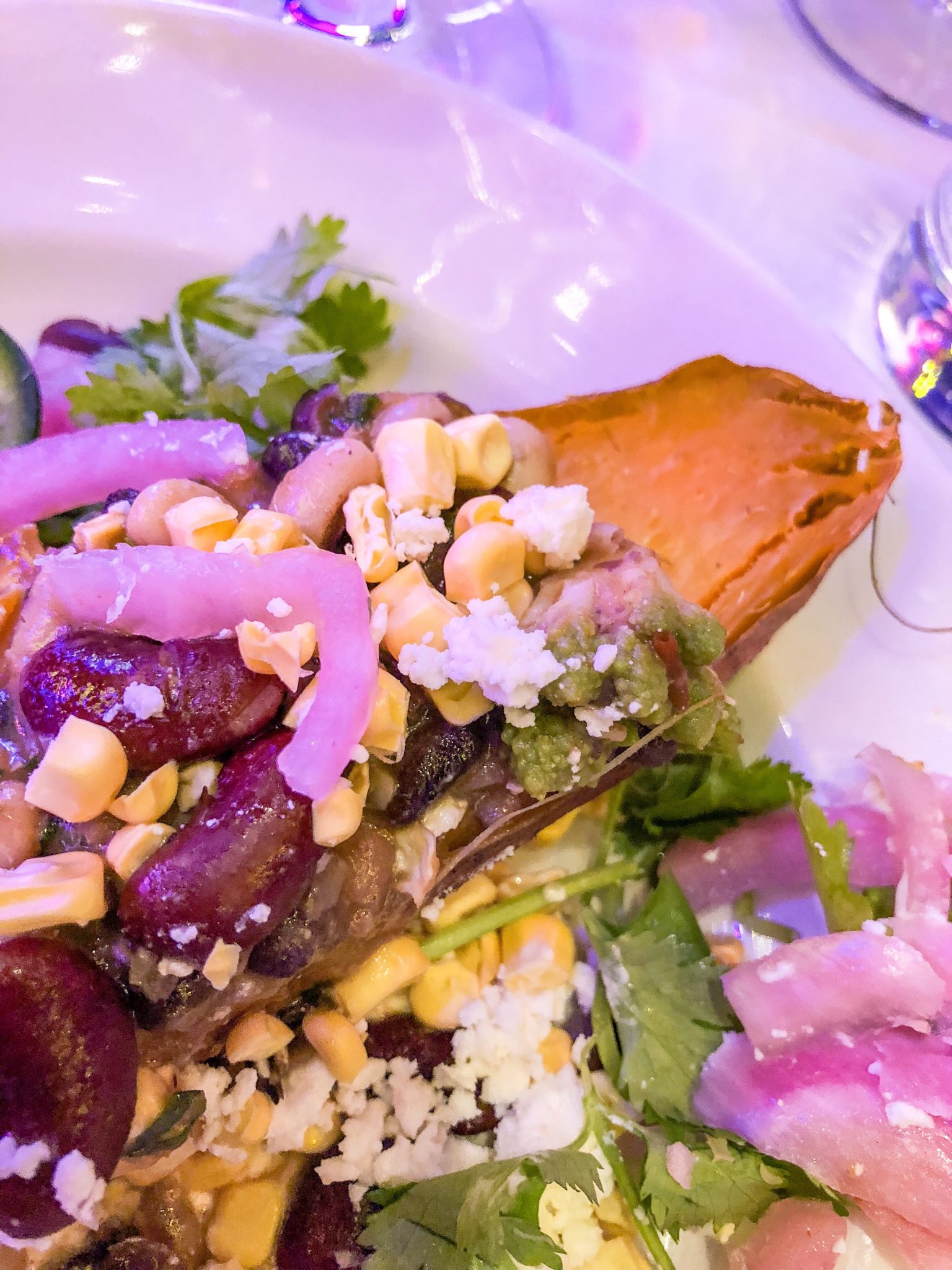Jag åt en vegetarisk rätt till varmrätt. En ugnsbakad sötpotatis med någon fetaost/bönröra uppepå som var jättegod!