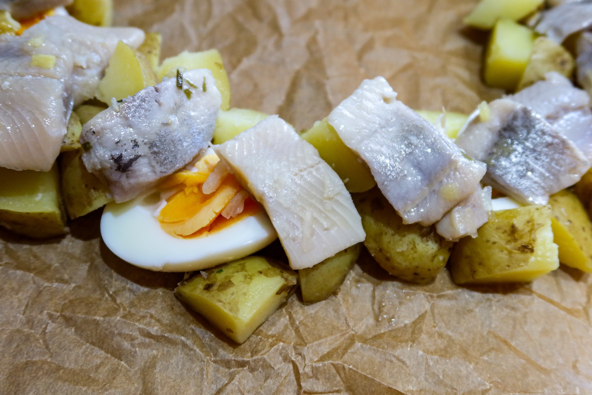 2) Koka äggen och potatisen. Dela äggen på mitten. Dela potatisen i fyra. Ta t ex en träskärbräda och lägg ut ett bakplåtspapper på den. Fördela ut ägg, potatis och sillbitar.
