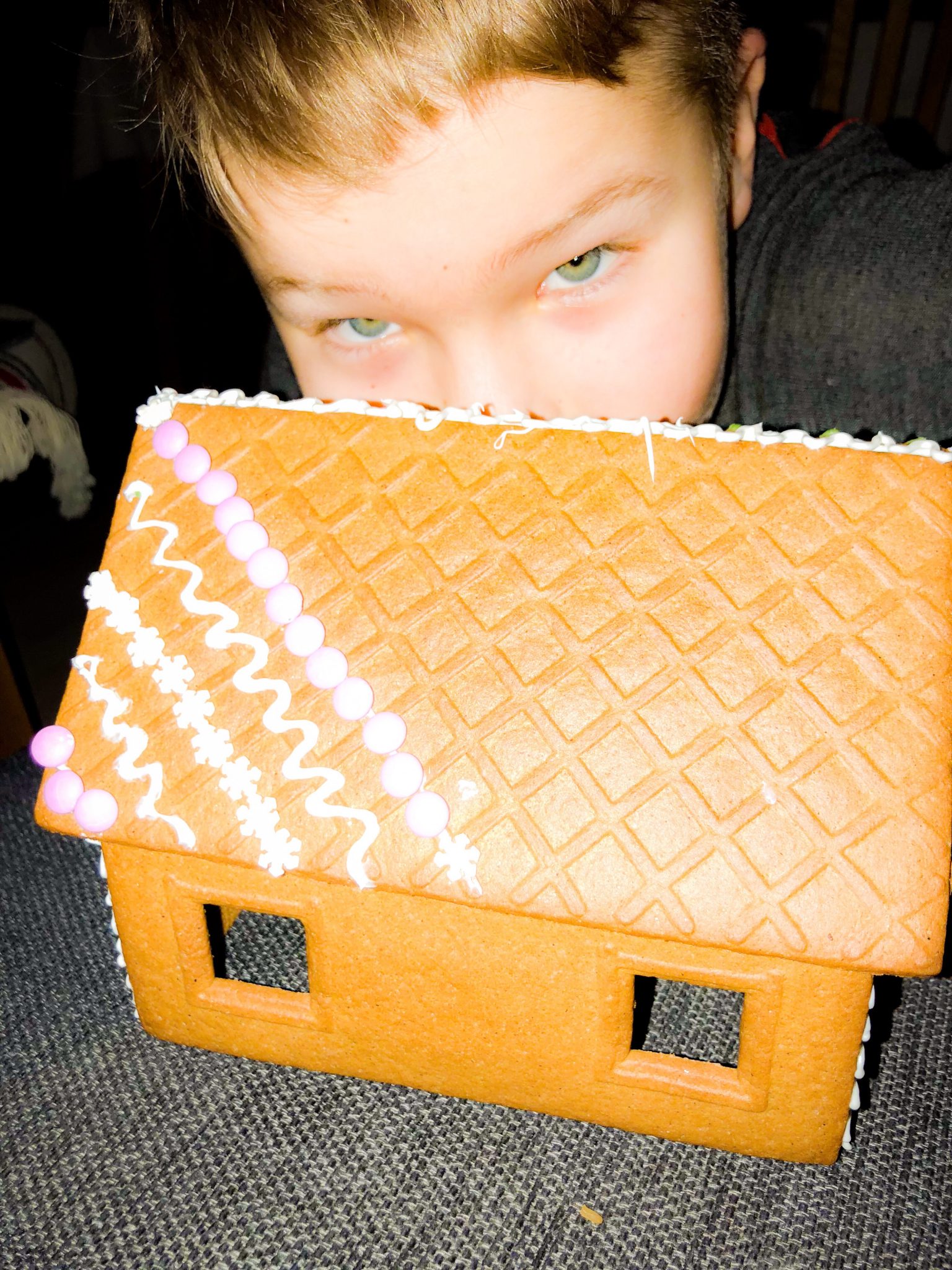Igår morse startade vi dagen med att börja nafsa på vårt pepparkakshus. Ingen idé att ta med det hem och då det bara stått sen julafton är det ok att käka upp hela skiten.