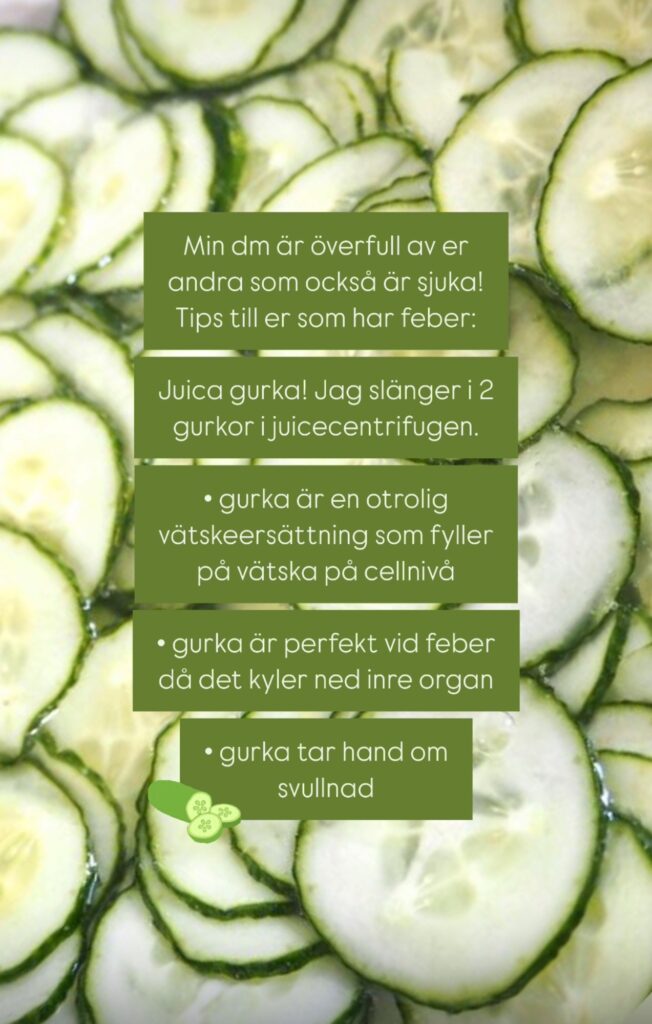 Bara köra 2 gurkor i en råsaftcentrifug eller liknande. Drick och känn hur du svalnar av alltså. Skön känsla när man har feber.