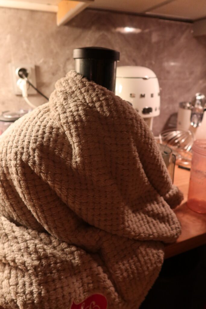 3) Låt stå och dra i ca 10 min, täck gärna över koppen så den håller värmen, jag brukar vika ihop ett par kökshanddukar som jag bara lägger över. Du kan också värma den några sekunder i mikron om du vill.