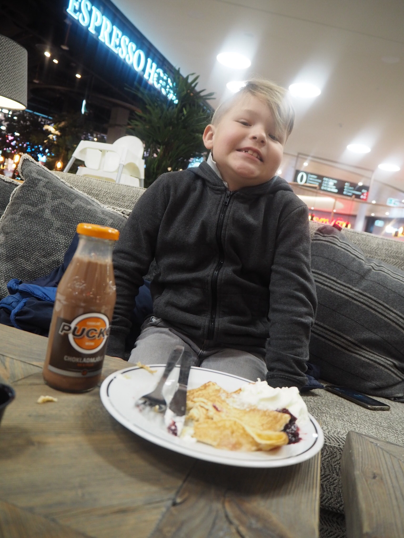 Vi börjar dagen med frukost på Espresso House. Milo lyxar med pannkisar och Pucko. Mamma med grön te och glutenfri smörgås med cream cheese och sylt. Jag har skönaste fakepälsjacka som jag bara älskar! Har haft sååå mycket användning av den. Förresten, handlar du på Cellbes nu så får du 10% rabatt om du handlar för över 400 kr och anger rabattkod: 18710, 15% rabatt om du handlar för 600 kr och anger rabattkod: 18715, 20% rabatt om du handlar för över 800 kr och anger rabattkod: 18720.Nu ska vi fortsätta mysa här. Får se om vi får till någon bio sen också. Men idag handlar det nog mest om att hänga tillsammans och göra det som faller oss in.