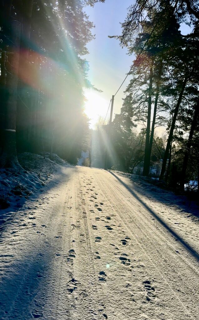 Vår promenad i solen igår var magisk. Vi gick bl a längs isen och solen gassade. Så härligt på alla sätt. Få den där krispiga fräscha luften i lungorna, lite isande på kinderna och känna solens strålar i ansiktet. Nej men helt fantastiskt om du frågar mig. Måhända jag romantiserar de där promenaderna men lär man sig att älska dem vill man bara inte vara utan.