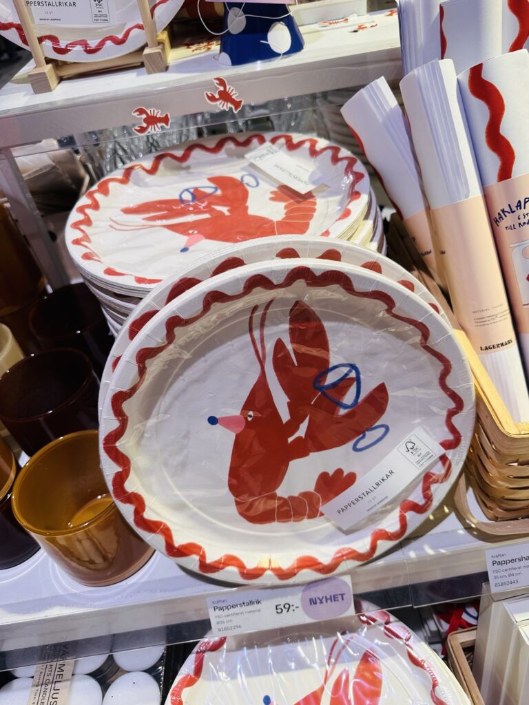 Underbara papperstallrikar (<klicka) med en festlig kräfta med ett vinglas. Tog ett tag innan jag upptäckte det, men den var ju hur festlig som helst. De nedersta tallrikarna hittar du HÄR, lite mer fancy och clean kanske.