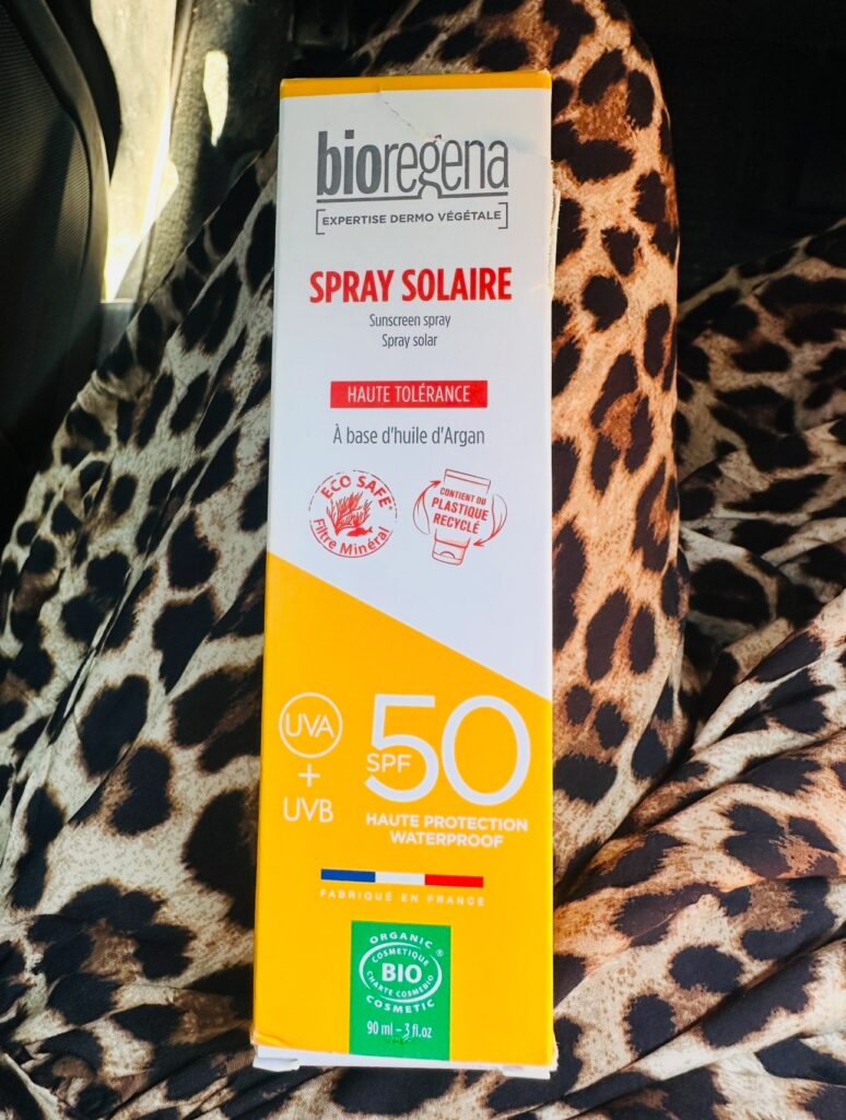 Och eftersom jag är en känslig själ (du som hängt här ett tag vet ju…), så är bra produkter ett måste när jag är i solen. Jag har i sommar använt Bioregena SPF 50, som är en ekologisk, naturlig solskyddsfaktor med mineralskydd och arganolja. Snäll för huden, snäll för havet och den ger riktigt bra skydd utan att kännas kladdig. Jag smörjer mig alltid innan jag går ner till bryggan.