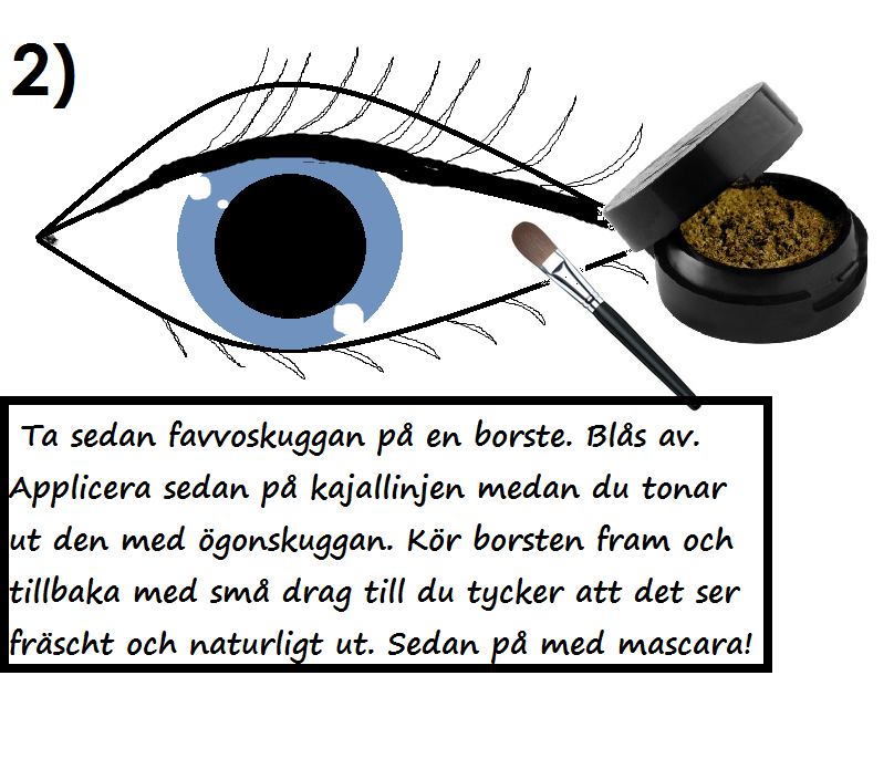 Ta sedan favoritskuggan eller någon annan passande skugga på en borste. Blås av lite. Applicera sedan över kajallinjen med små drag. Dra gärna borsten fram och tillbaka i små rörelser så att kajallinjen liksom sotas ut tillsammans med skuggan. Våga gå lite uppåt på ögonlocket oxå för att få lite mer effekt. Detta går absolut (och gärna) att göra exakt likadant på nedre fransraden. Denna variant är oftast snyggast men ser genast lite mer mejkad ut. Avsluta med mascara och lite böjda fransar så har den kanonfin vardagslook utan att se för sminkad ut!