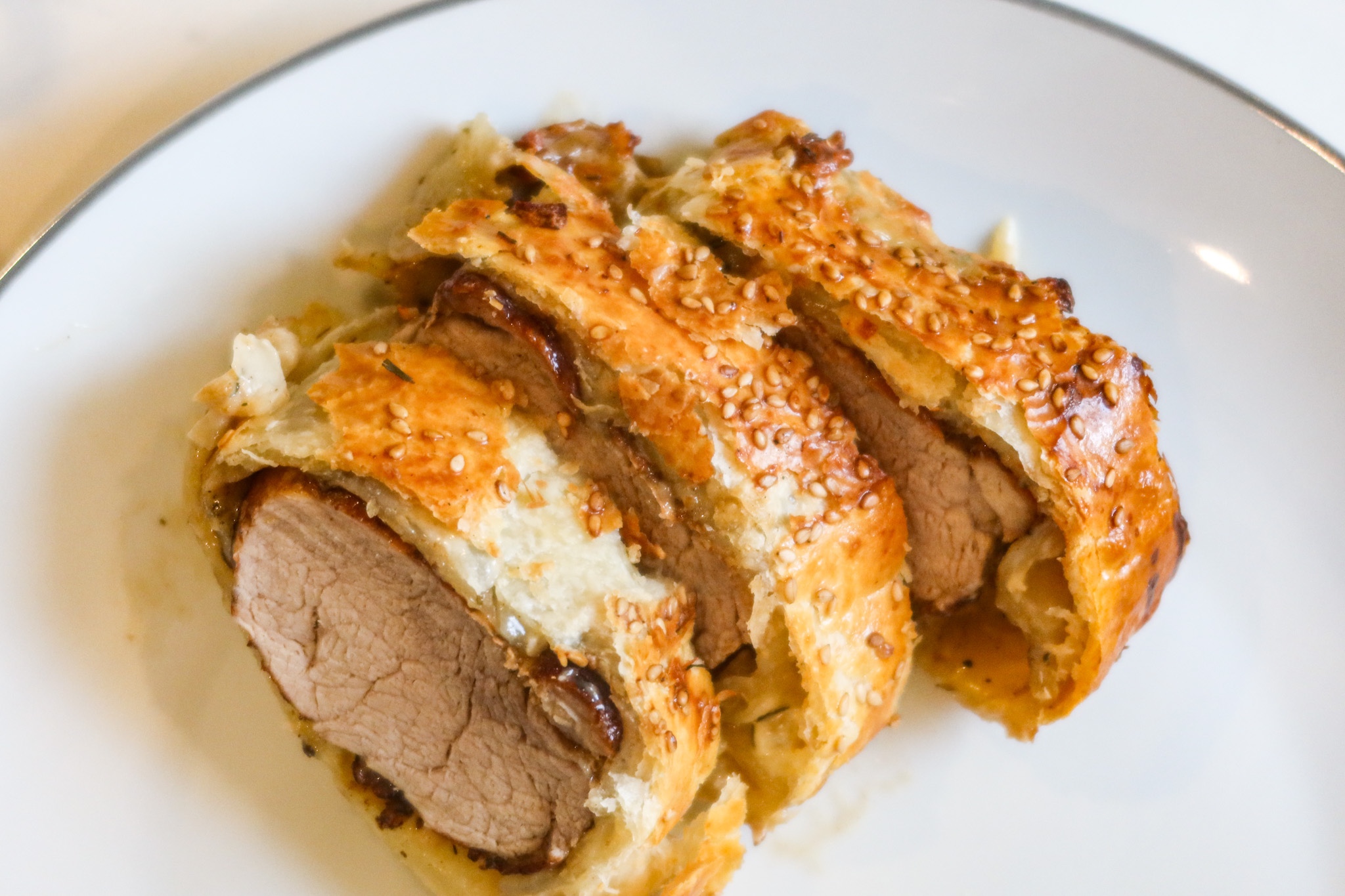 3) Bred ut röran på smördegsplattan. Lägg på köttet och rulla in det, se till att ha kanten mot botten. Stäng igen sidorna så det inte rinner ut något under tillagningen i ugnen. Vispa upp ägget och pensla sedan smördegsrullen med det, strö över sesamfrön. Sätt i en termometer, in i ugnen på 225 grader 70 grader så är köttet klart, du kan också ha 68, då blir det lite rosa men fortfarande genomstekt. Det tar ungefär 25-30 min.