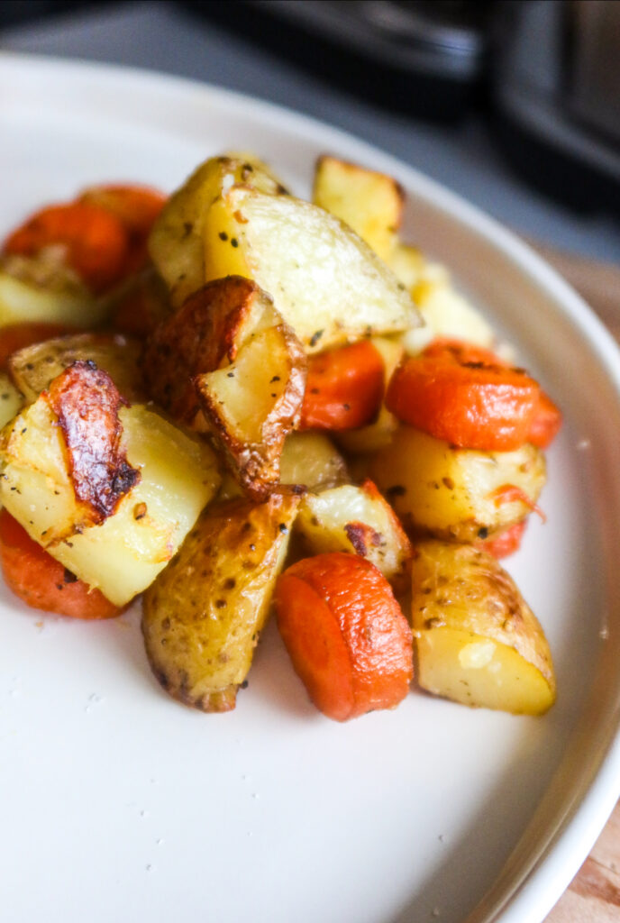 1. Skala morötterna och rotselleri. Skölj potatisen. Dela allt i mindre bitar. Lägg på ugnsplåt. Häll över olivolja, salt & peppar. Ställ i ugnen på 225 grader i ca 30-40 minuter. Rör om lite då och då. Det är klart när allt är mjukt och fått lite färg.