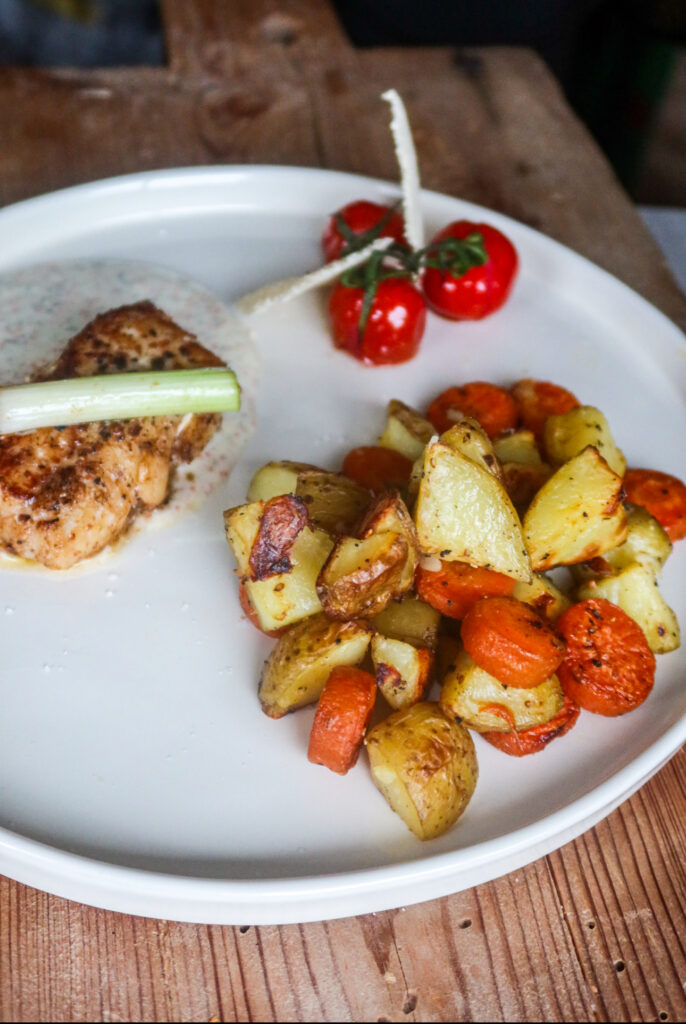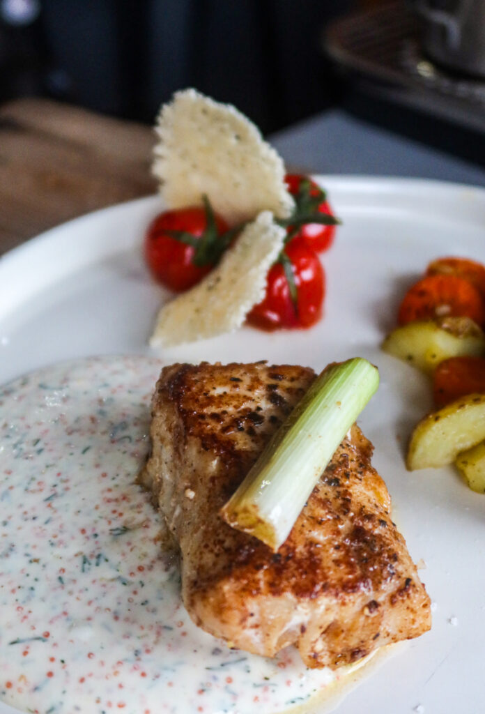 Denna smörstekta torskrygg serverades med romsås, rostade rotfrukter och sen blev det även parmesanchips och ugnsbakad tomat.