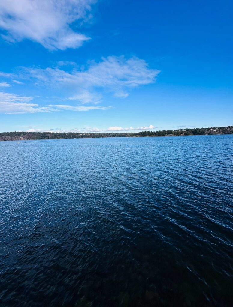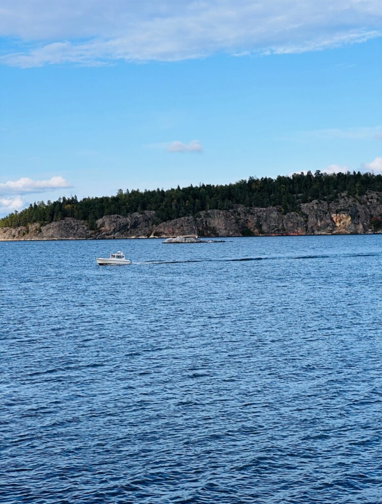 Tony passade på att gå runt och fota lite och så kunde man klättra upp i detta utsiktstorn på vägen. Utsikten var magisk. Här stod vi och kikade ut över vattnet. Så idylliskt med den puttrande båten som just passerade. Sverige är bra jädra vackert hörni!