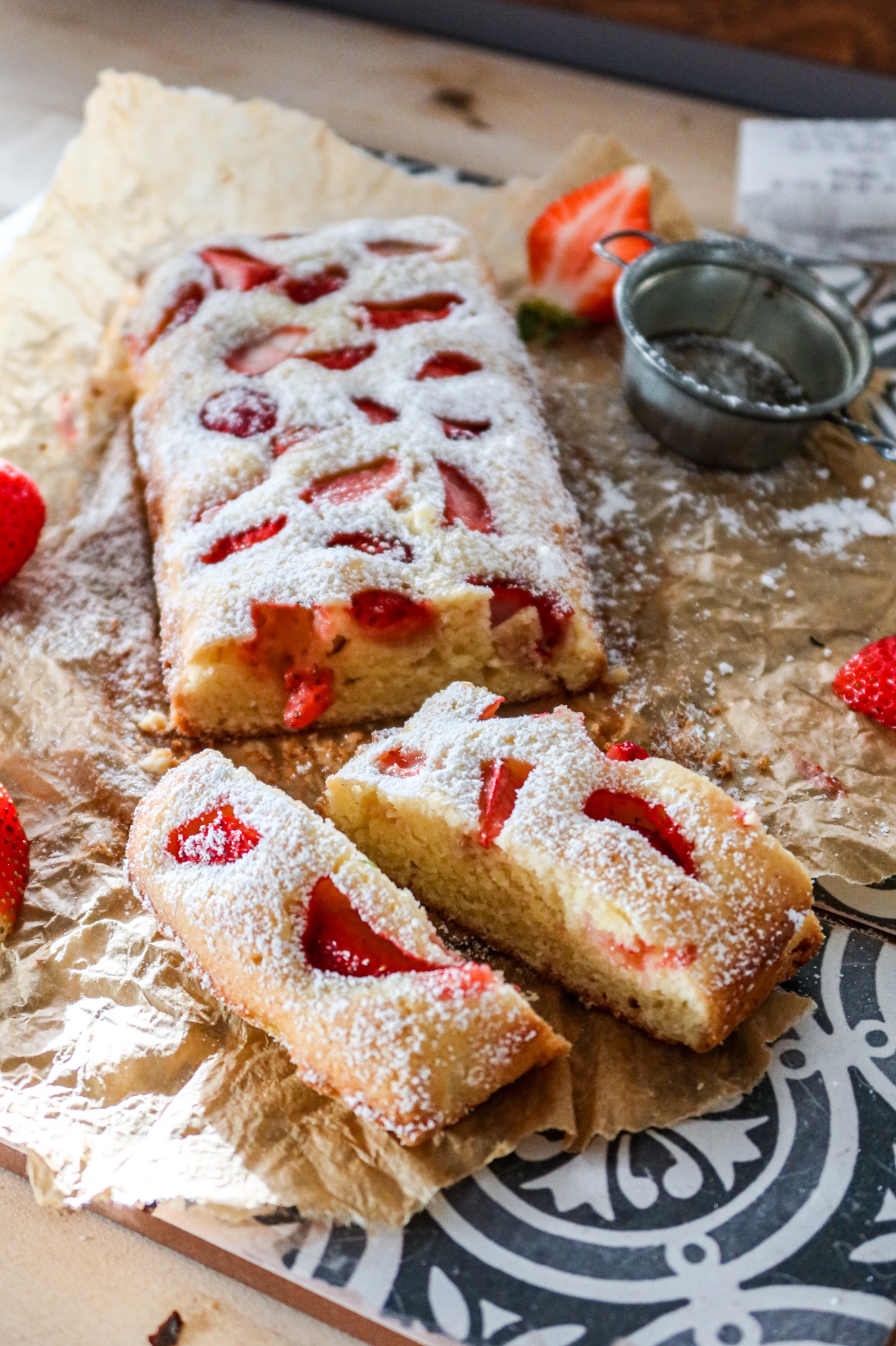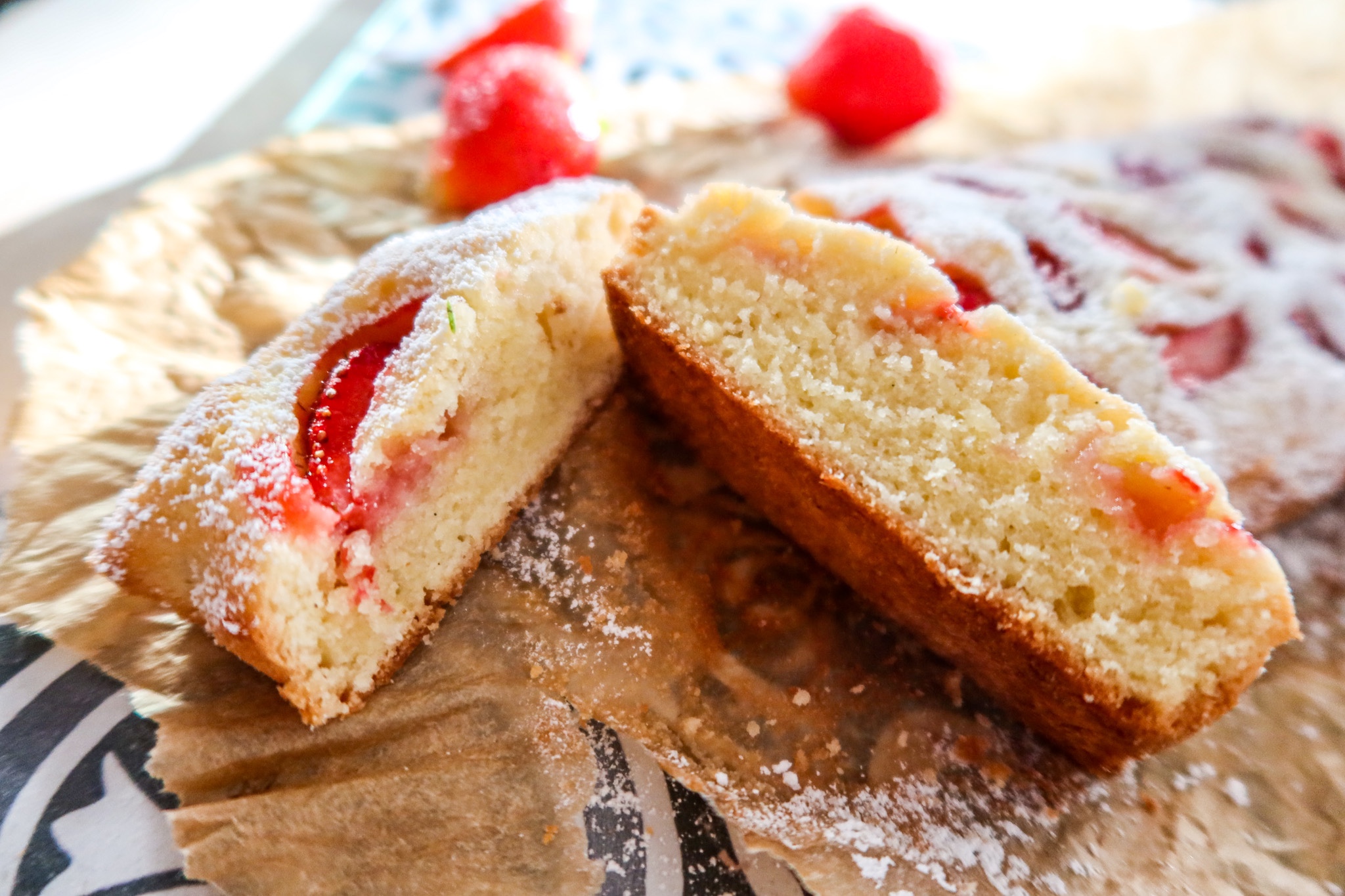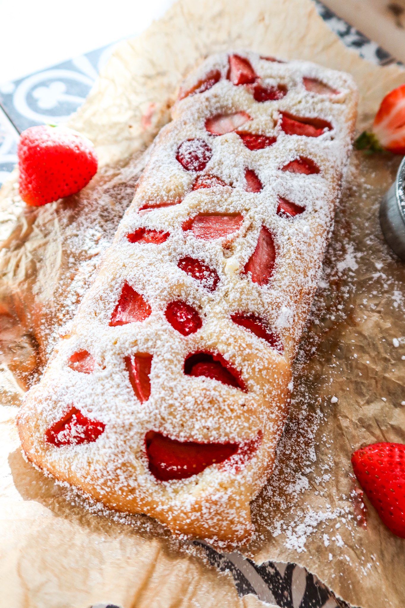 3) Lägg bakplåtspapper i botten på en brödform. Häll i smeten och lägg på några klyftade jordgubbar.