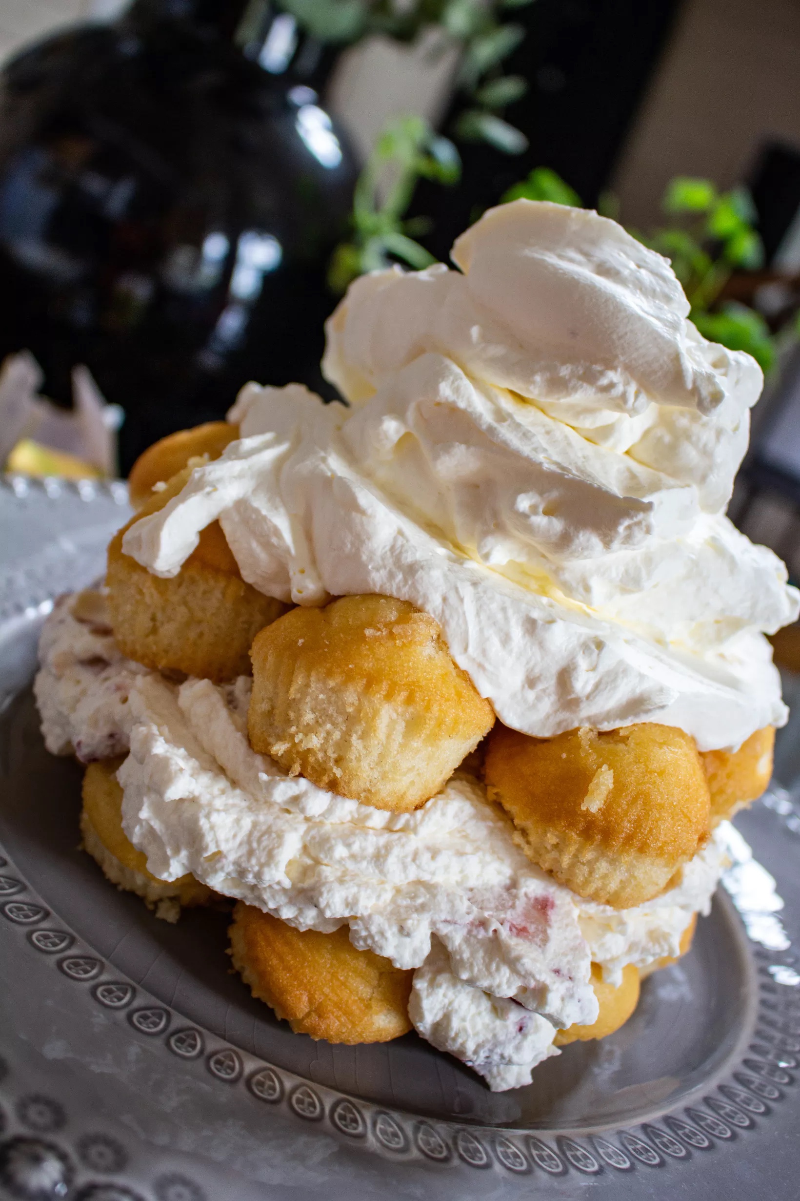 3) Lägg 1 påse citronmuffins på ett tårtfat. Jag la dem som formen av en tårta. Bred över fyllningen. Lägg 1 påse citronmuffins över fyllningen. Fyll sedan på med resten av grädden och spackla in tårtan med den.