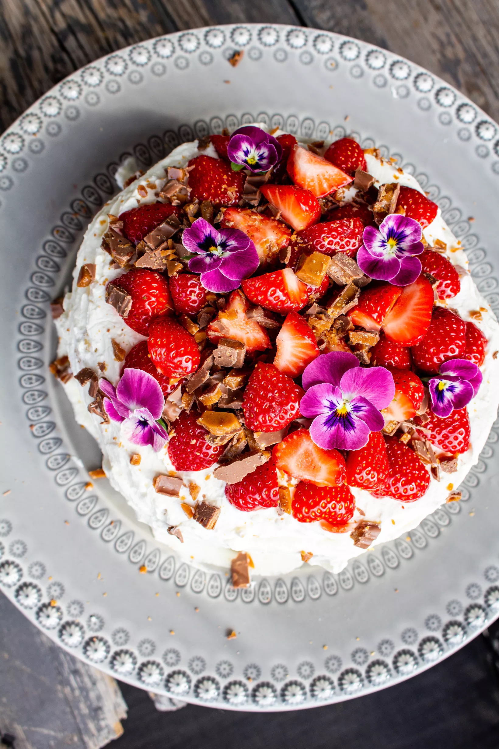 4) Toppa med jordgubbar och hackad Daim. Ha gärna på ätbara blommor också. Sååå gott och vackert!