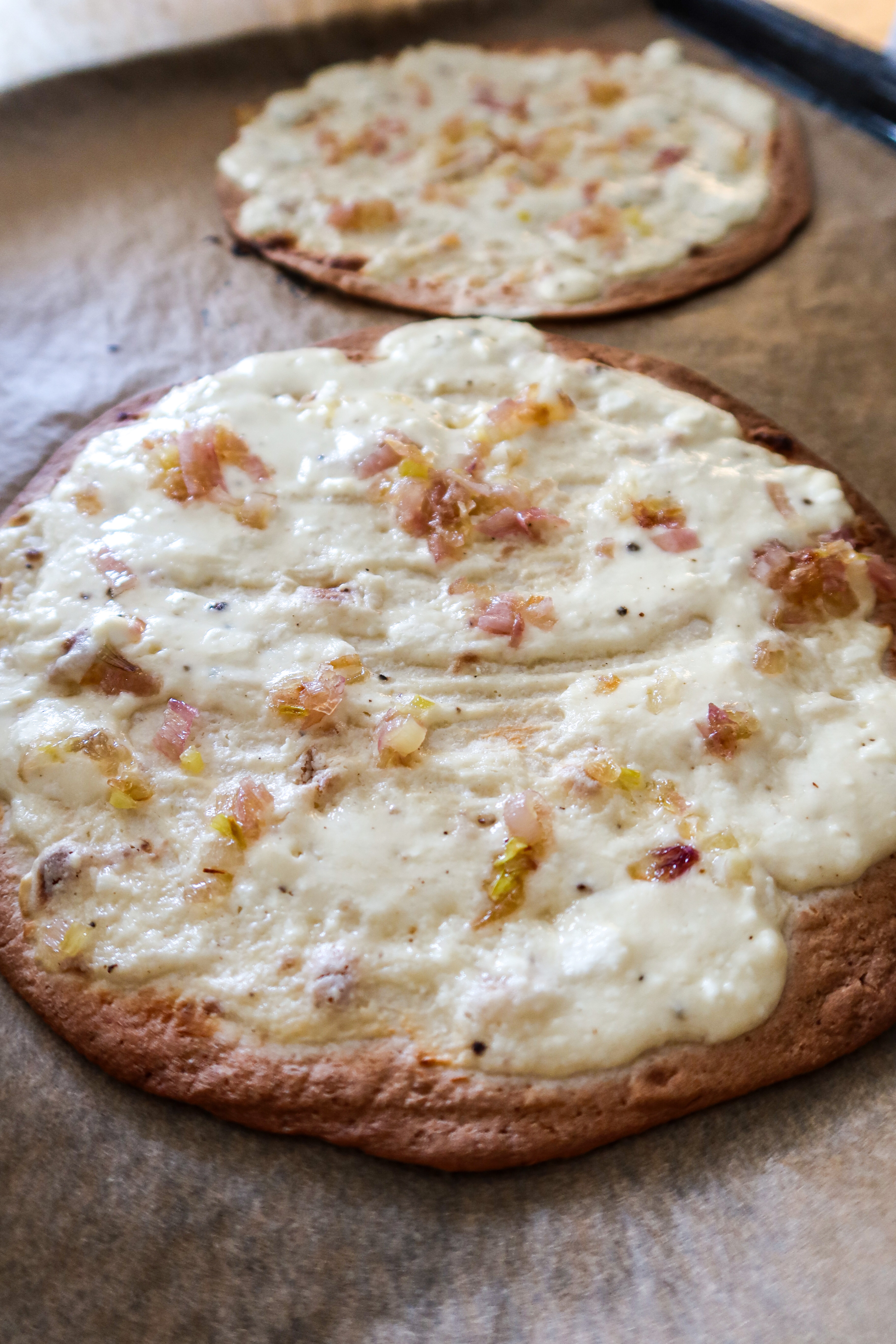3) Lägg 2 tortillabröd (alla om du får plats) på plåten. Bred på 2/3 (spar 1/3 av den till att klicka på senare) av fetaostkrämen på alla. Ställ in i ugnen i ca 5 minuter. Ta ut.