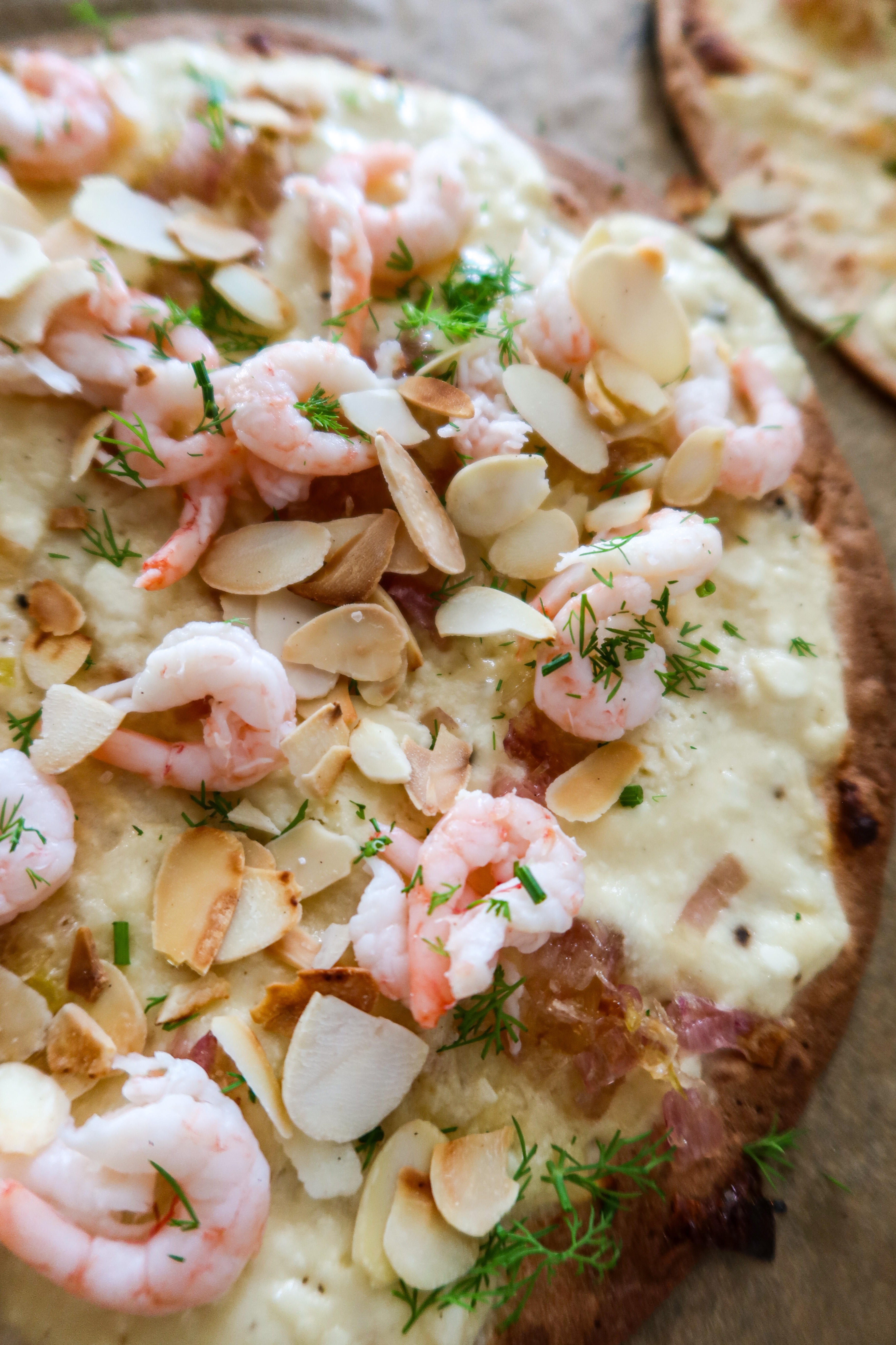 4) Lägg på färska räkor, mandelflarnen, karamelliserad lök, klicka på fetaostkräm och klipp till sist på dill. Vik ihop en gång och njut. Så sjukt gott!