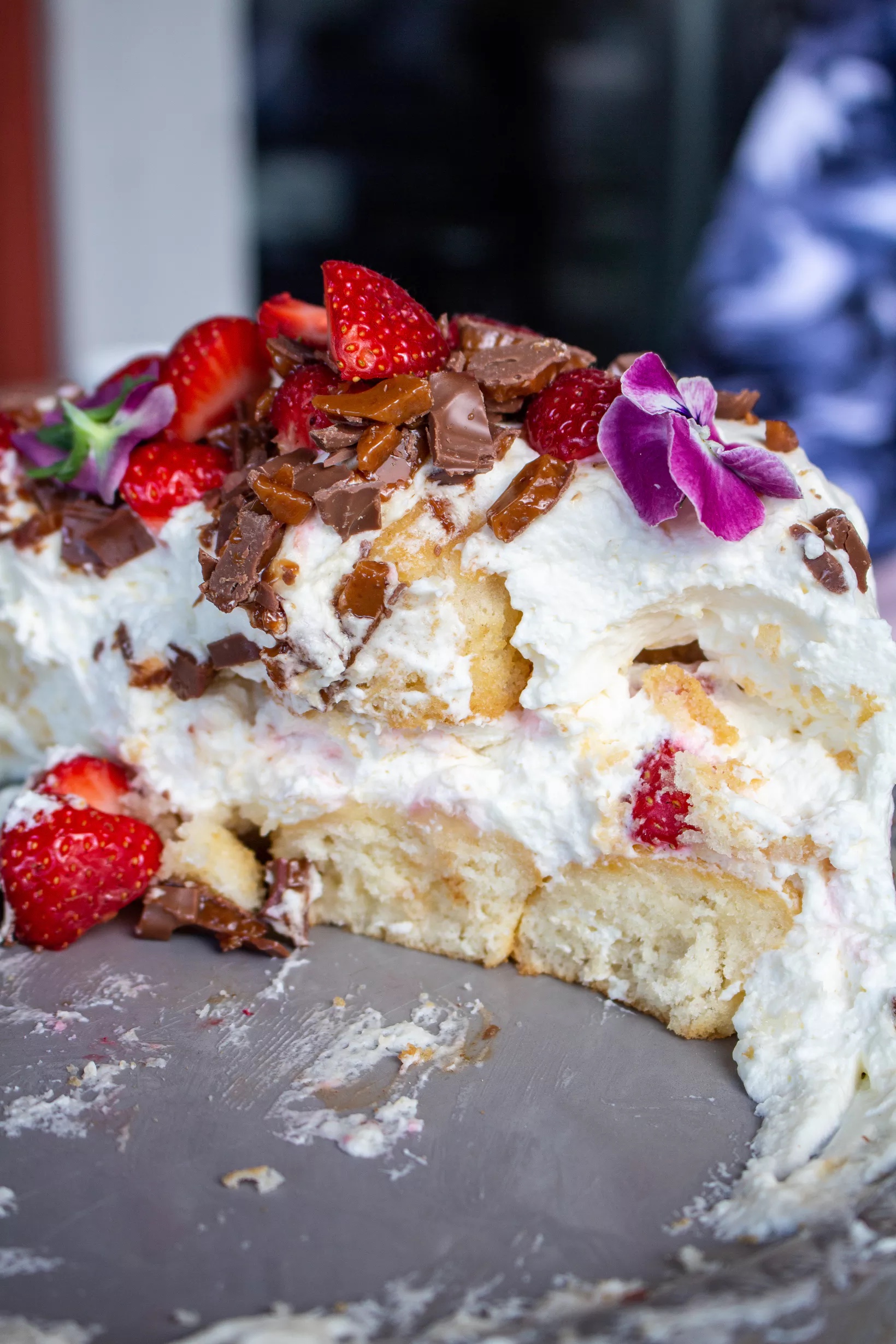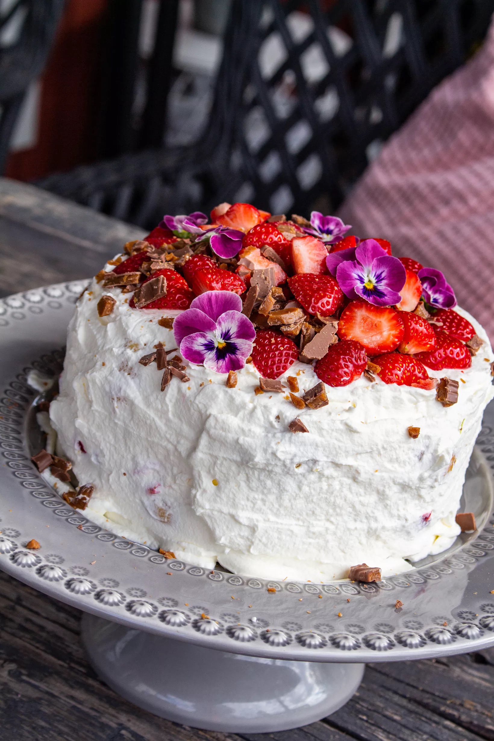 4) Toppa med jordgubbar och hackad Daim. Ha gärna på ätbara blommor också. Servera!