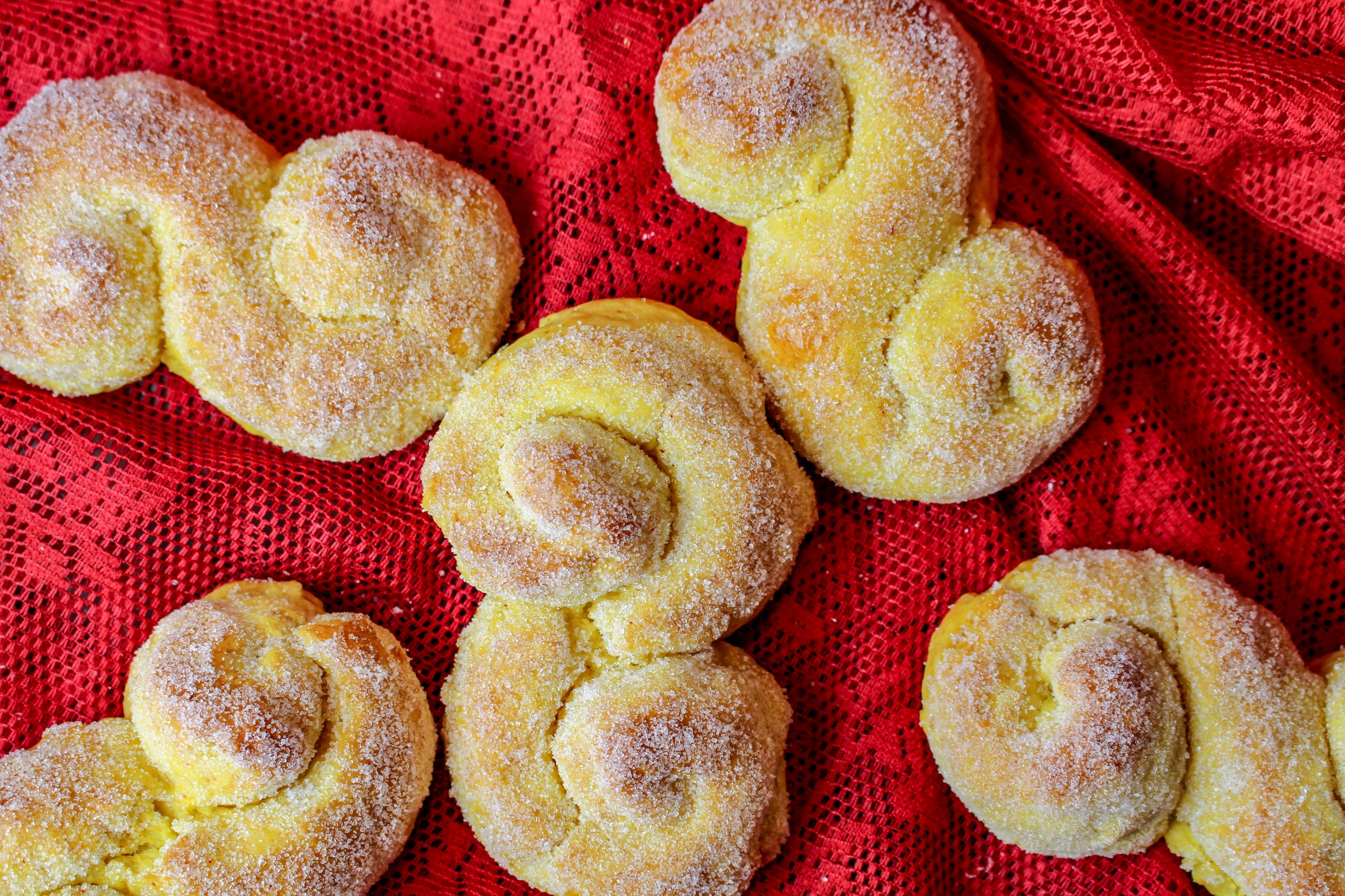 5) Ta ut och låt svalna. Blanda sirap med lite vatten. Pensla lussebullarna med sirapsblandningen. Häll strösocker i en djup tallrik. Snurra runt bullarna så de får en sockrig yta. Ät och njut!