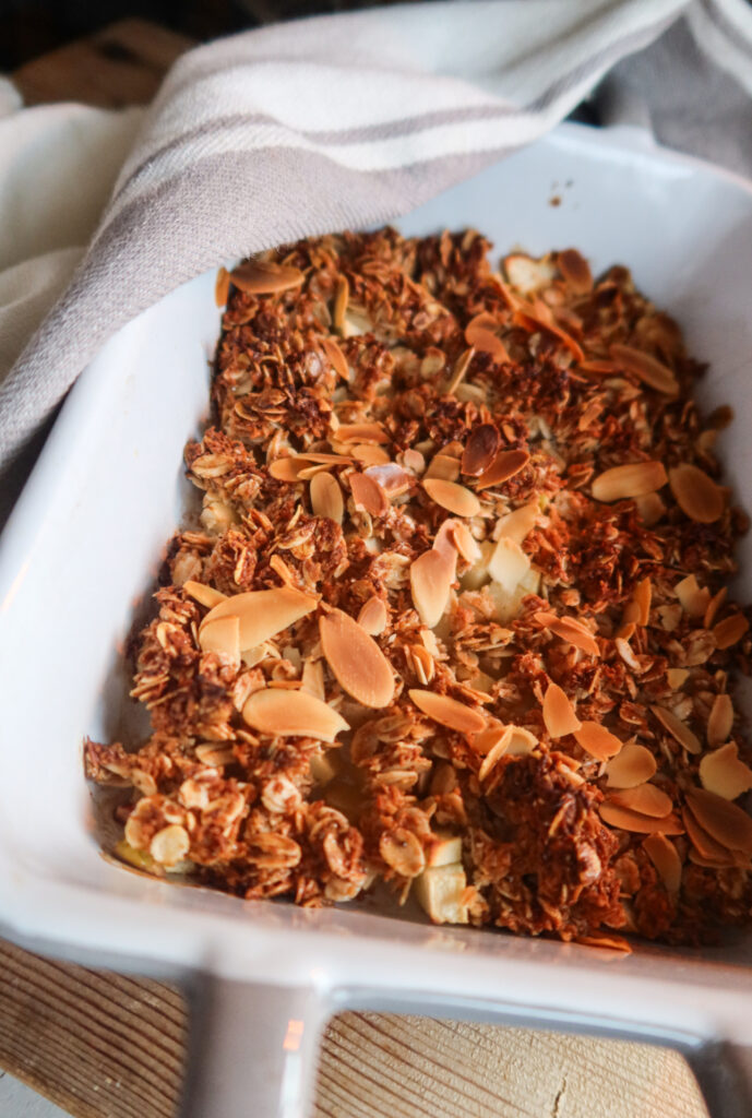 2. Blanda havregryn, kokos, kokosolja, lönnsirap, kardemumma, kanel, vaniljpulver och salt. Detta blir till en smulig massa. Strö på det på äpplena. Toppa med mandelflarn.