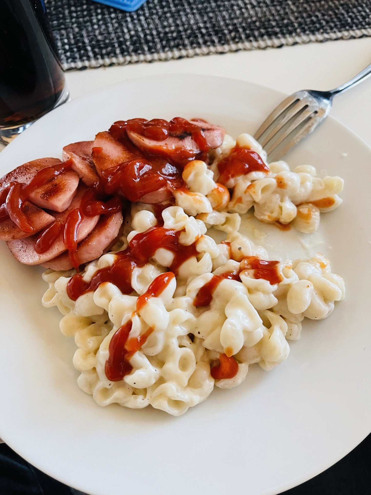 Ingen ketchup på stuvade makaroner. Bannlyst. Ketchup får det bli på vattenkokta makaroner så får falukorven också sin del + senap.