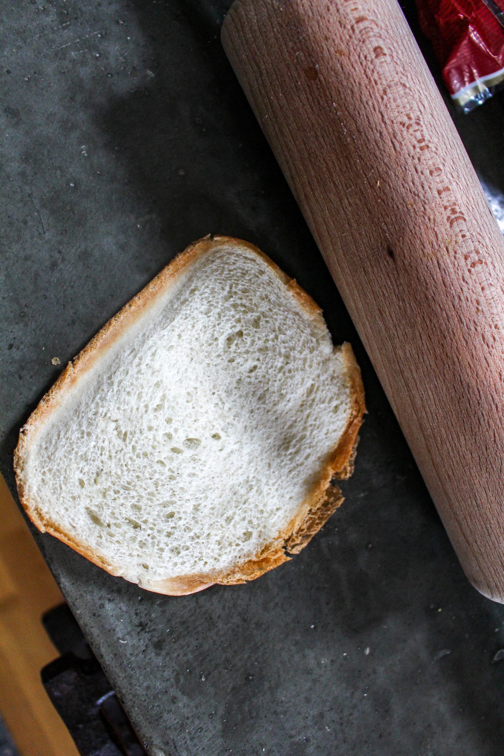 1) Börja med att kavla ut toastbröden så de blir helt platta. Skär ur rundlar ur varje bröd, de kan vara ca 10 cm i diameter.