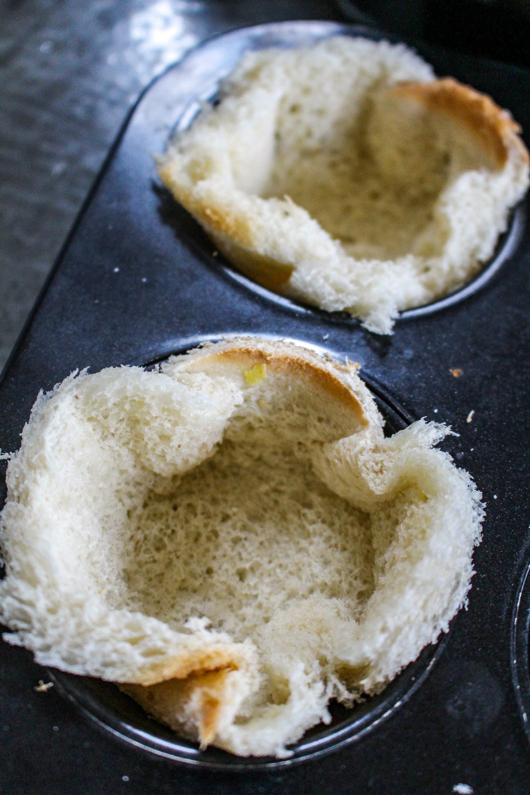 2) Lägg i dem i en muffinsform. Jag pressade brödkanterna så att själva ”hålet” blir ganska så stort.