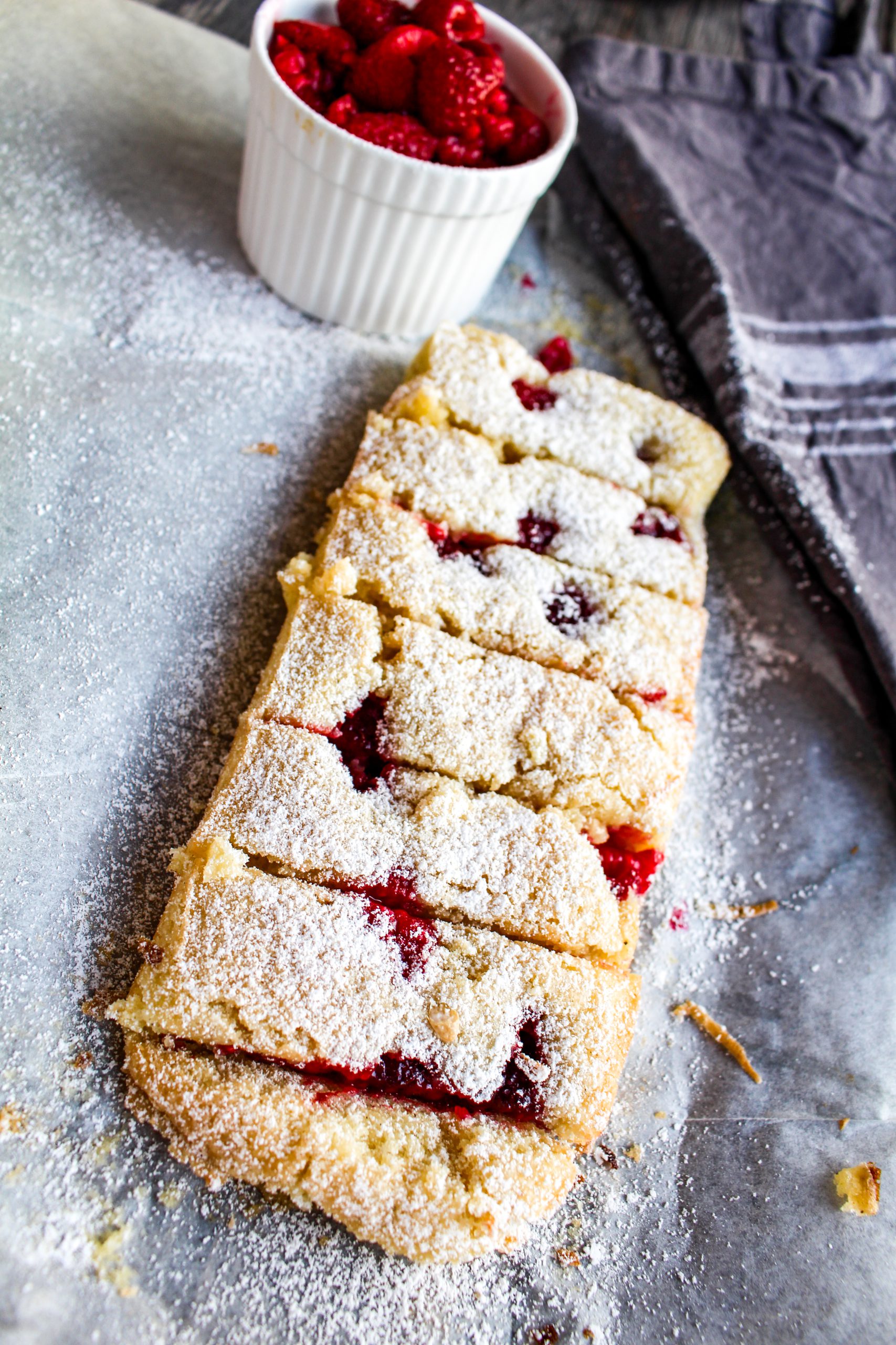 3) Lägg bakplåtspapper i botten på en brödform. Häll i smeten och lägg på några hallon.