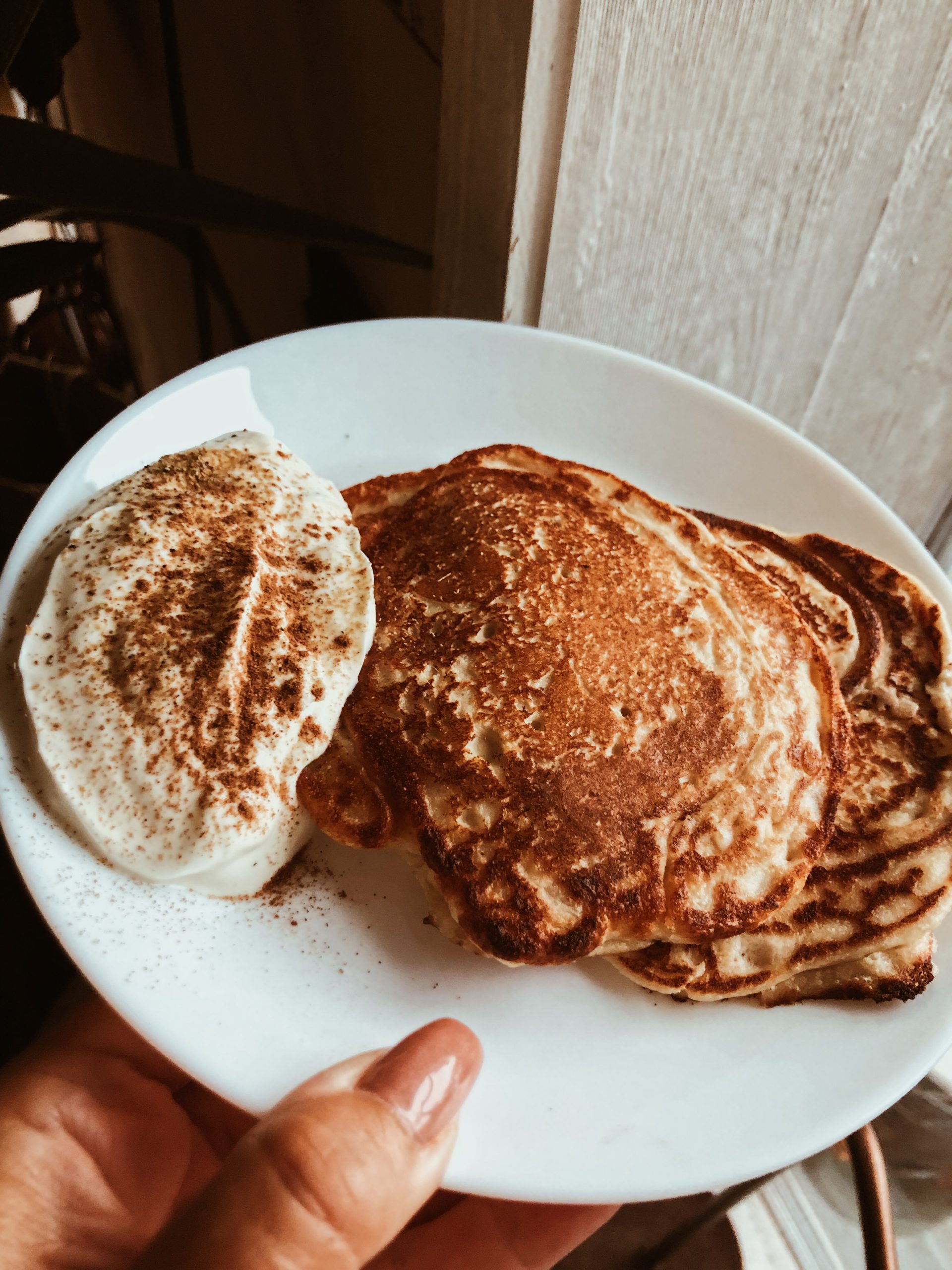 Äsch, det blev proteinpannkakor. Har världens bästa pannkaksmix som jag bara blandar ut med havremjölk. In i en shaker, blanda, låt stå ett par minuter och sen steker jag 3 små pannkisar i stekpannan. Älskar att äta det med turkisk yoghurt med kardemumma och kanel på.