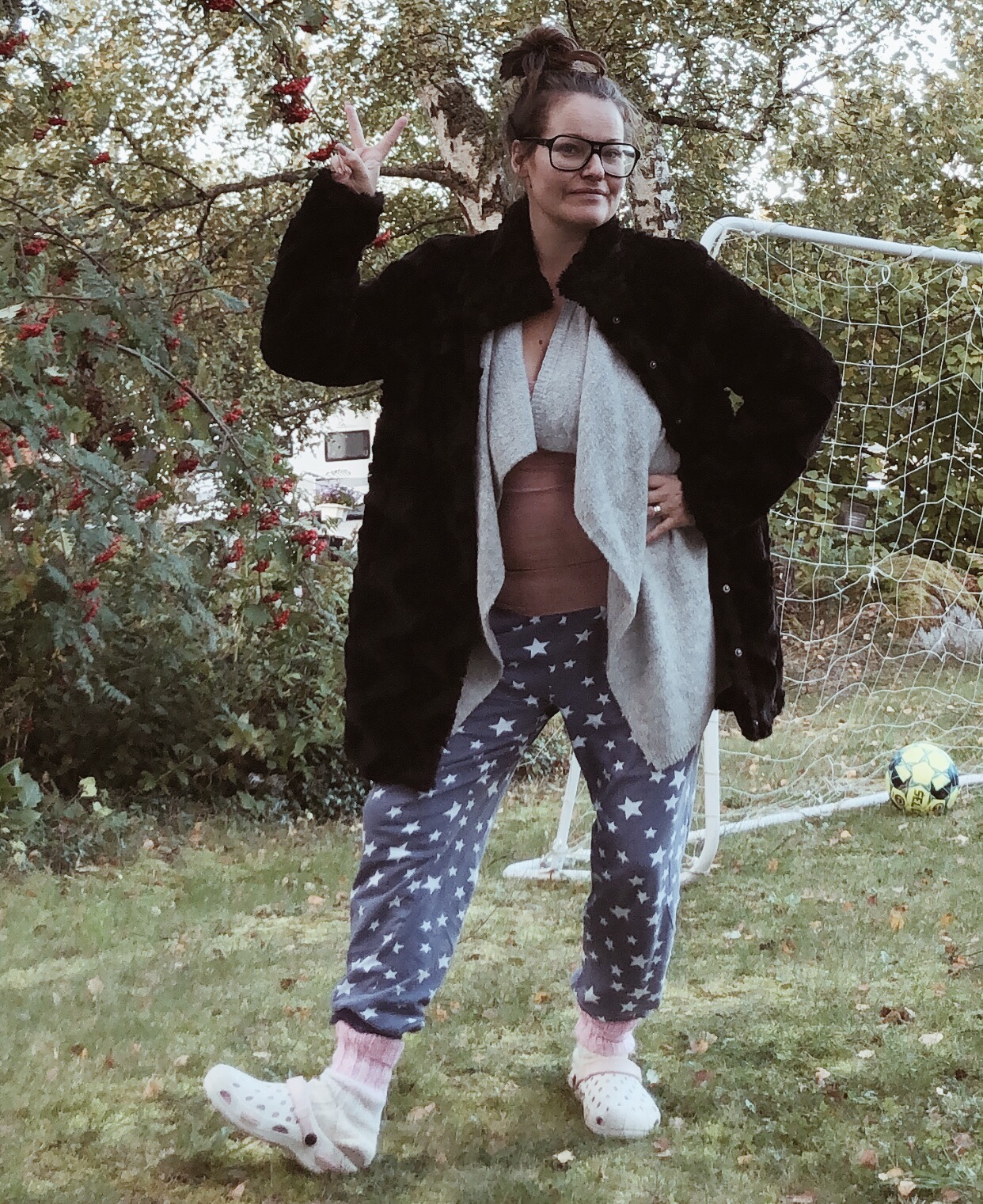 Här har jag varit iväg och kört barn till skolan, som vanligt i en väldans snygg outfit.
