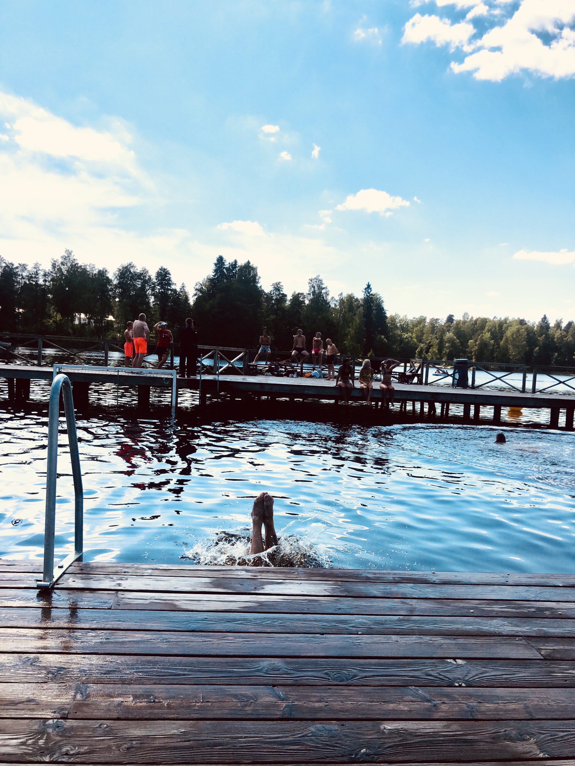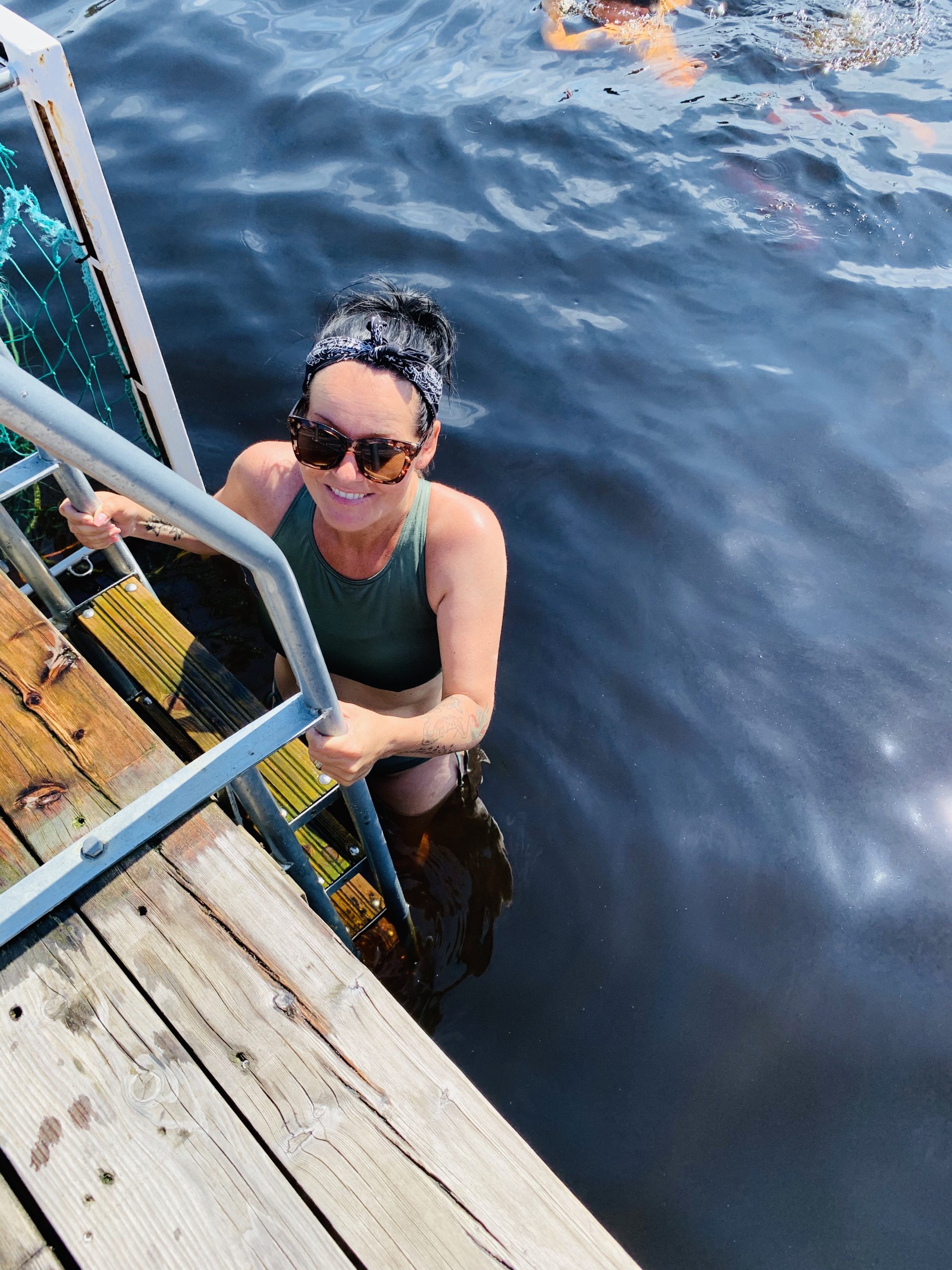 En minst sagt pinsam grej inträffade där på bryggan efter vi simmat klart. Jag skulle nämligen byta om och ni vet ju hur man får krångla och försöka skyla sig så gott man kan! Jag glömde dessutom att jag hade trosskydd i badbrallan varpå jag hoppar ur dom och ut flyger ett vattenfyllt trosskydd och lägger sig på bryggan. Ämen….. Farsan ba: ”Vad var det där för strumpa!?” Hahaha…. ämen svimmade jag av skratt eller?