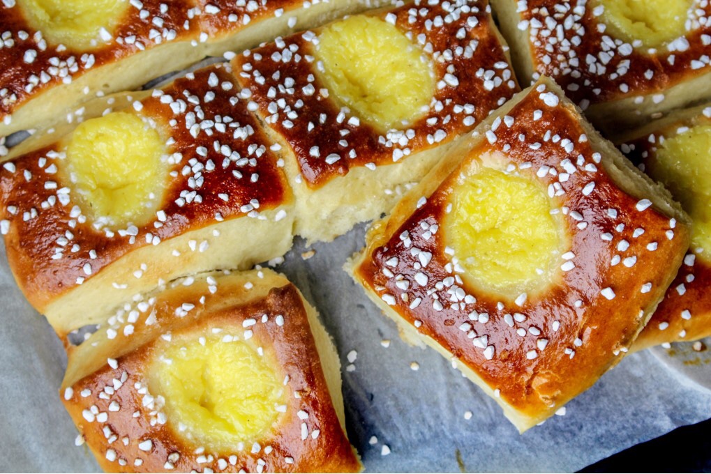 5) Låt jäsa i 30 min under bakduk. Dela sedan degen i 16 bitar med pizzaslice eller kniv. Pressa med en kork i mitten på varje så du får en grop. Ha i marsankräm i hålen.