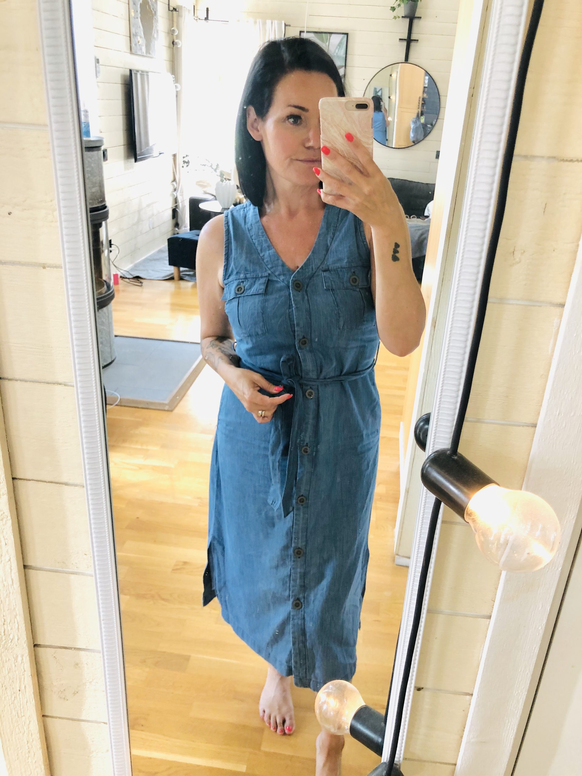 Hade på mig min nya jeansklänning igår och blev faktiskt förvånad över hur skön och luftig den var. Älskar den! Jag har stl 34/36 på min så jag skulle säga att den är lite lite stor i storlek. Jag är 36/38 i vanliga fall.