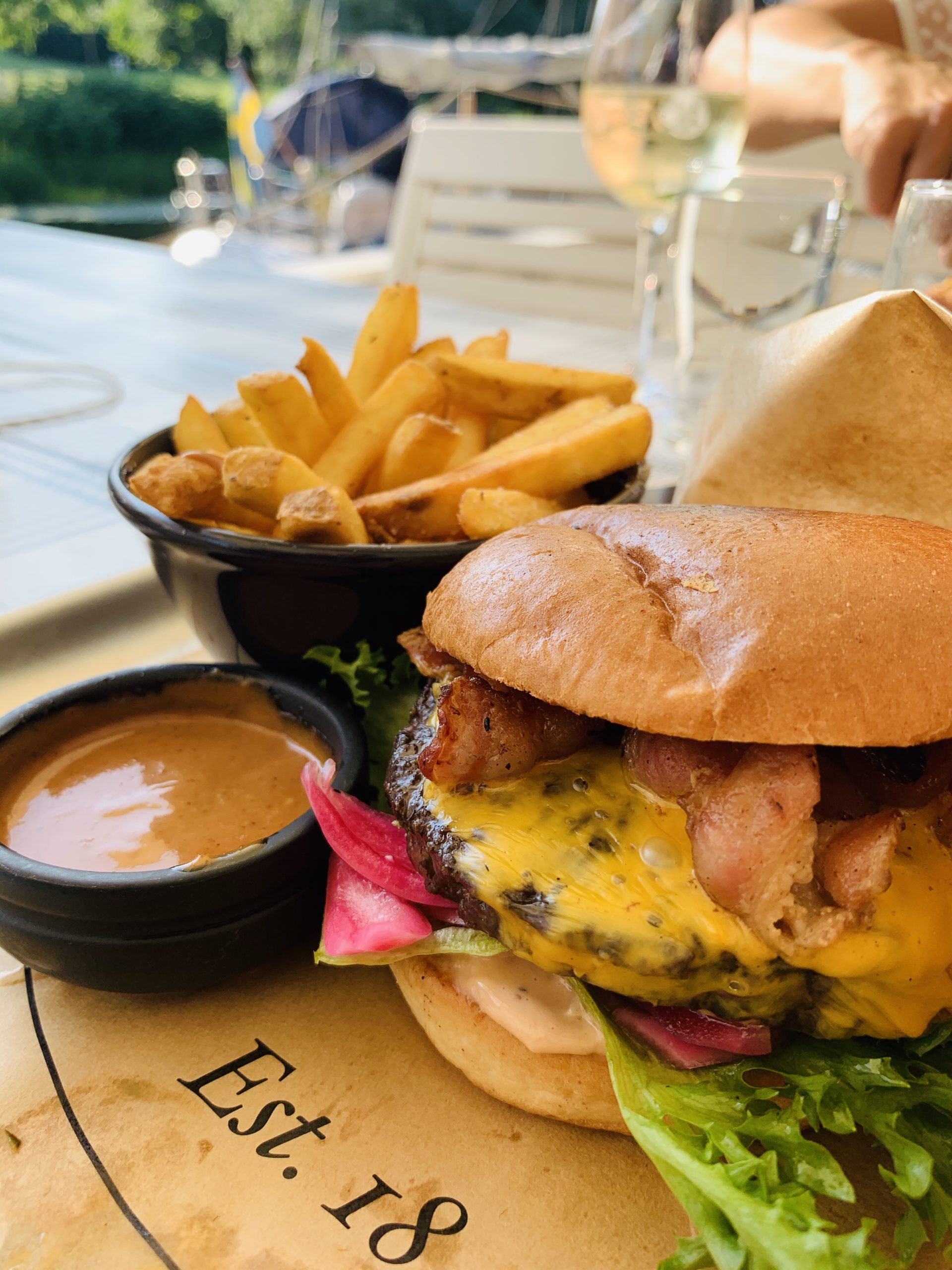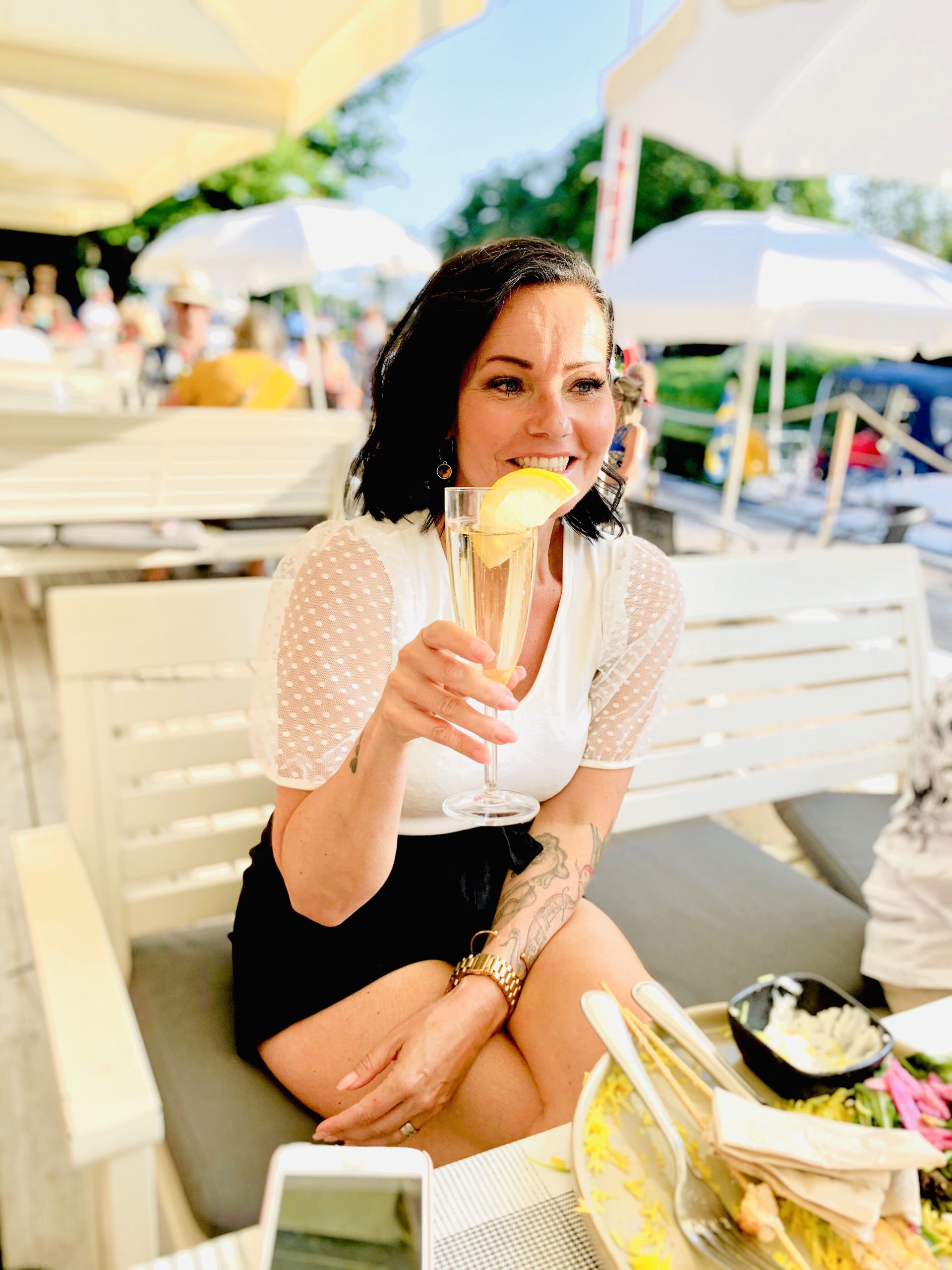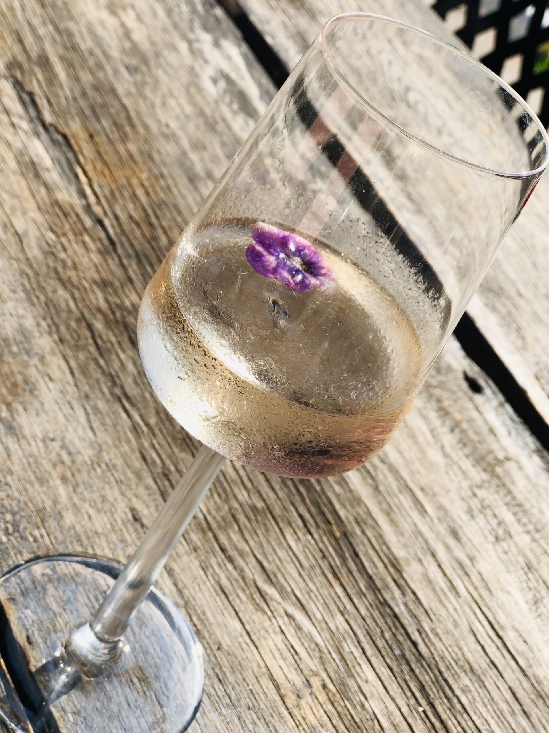 Efter gårdagens jobb så hade vi bokat bord vid hamnen för lite mat. Innan vi cyklade iväg så hällde jag upp ett iskallt glas med krispigt rosévin. Det var så varmt så glaset liksom frostades av det iskalla vinet. Så gott!