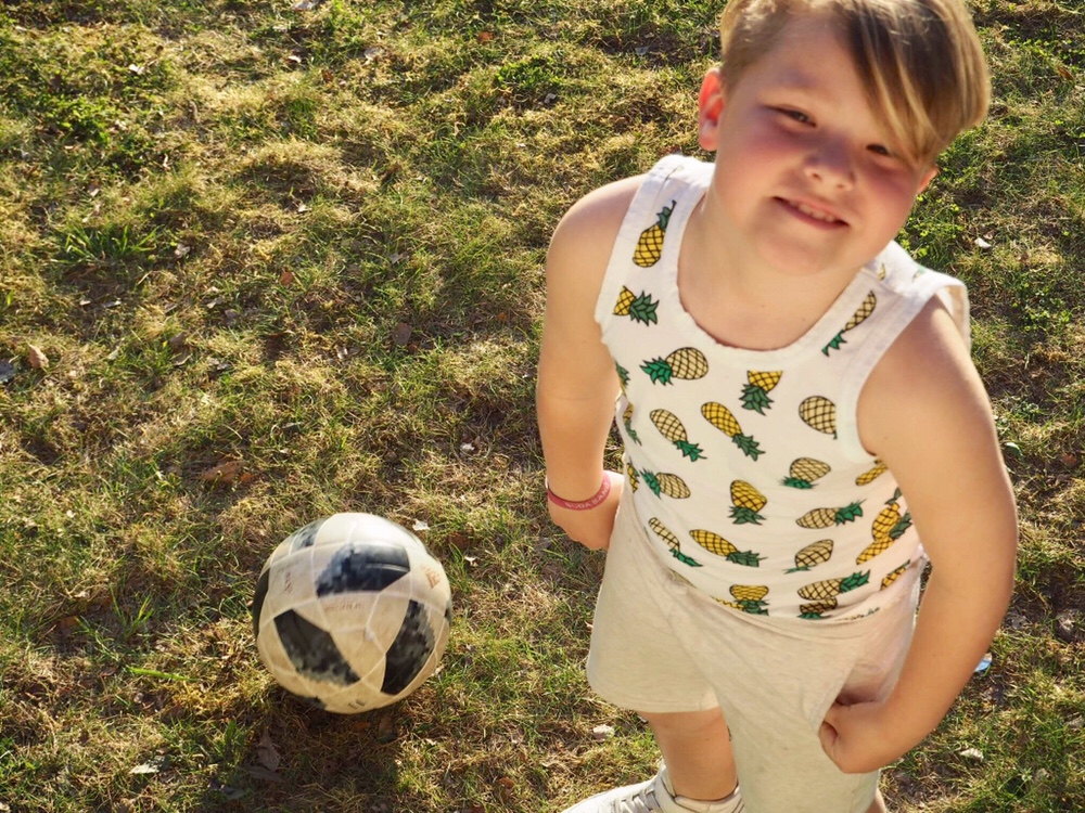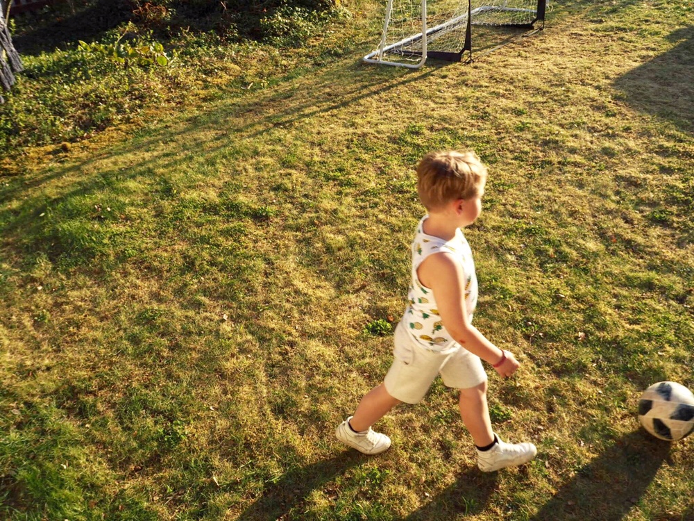 När vi kom hem åkte ananaslinnet och shortsen på. Sen var det ut och spela boll som gällde.