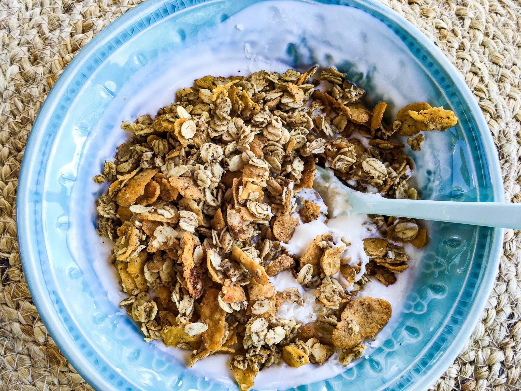 Igår svängde jag ihop lite egen musli. Såå god! Läste att cornflakes innehåller massor med järn som jag har brist på så de fick följa med.