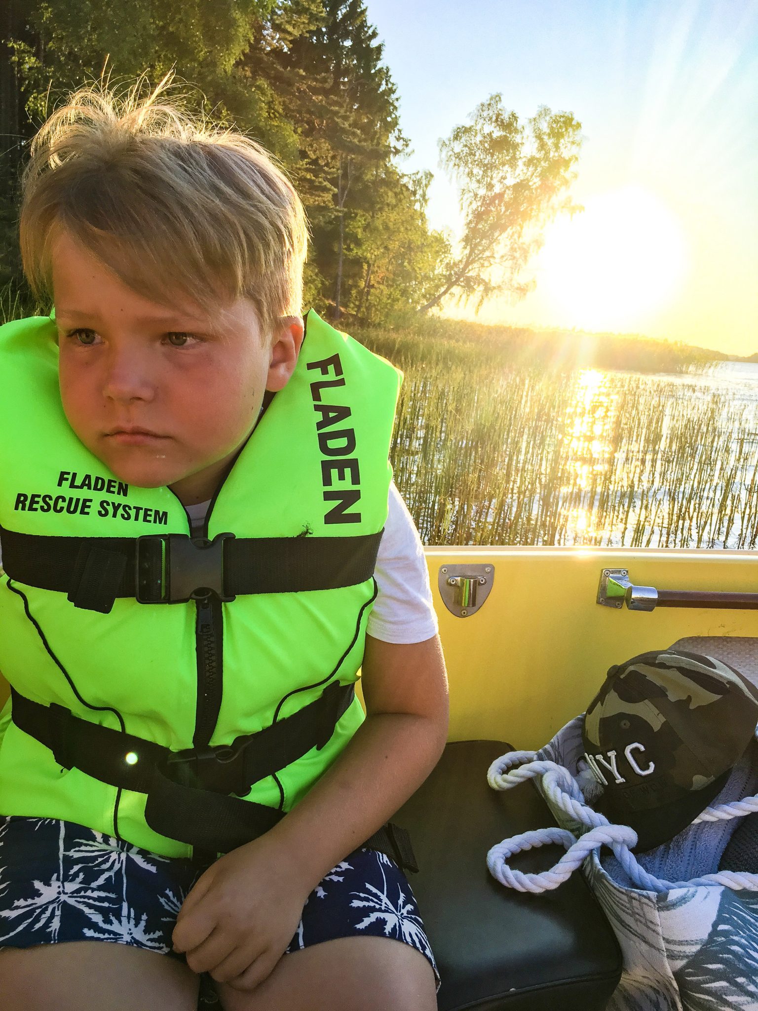 Milo ser mer bedrövad ut än vad han är. Han var lite trött när vi skulle åka hem och hade den stora lyxen att få åka hem hela vägen i båten. Han sov gott hela sträckan. Vi bäddade ned honom i en filt och sen snarkade han. Hur mysigt?