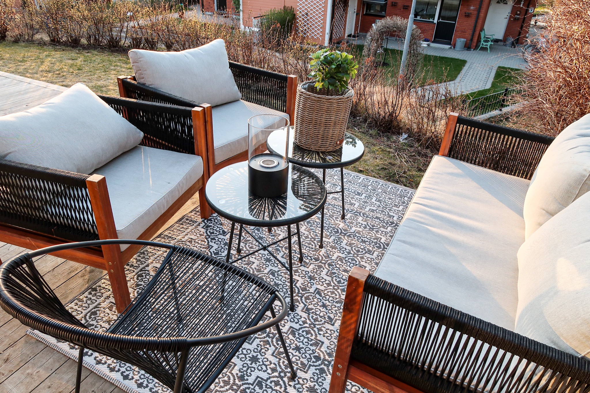 Gjorde en liten mysig sitthörna vid bordet också. Här gassar solen in från eftermiddag, här satt jag igår i solen och stormtrivdes. Ett tips till dig som vill fylla ut altanen och göra det lite mysigare är att göra exakt såna här små sittplatser. Tänk matta, skön stol, ett litet bord och kanske någon dyna eller pläd så blir det hur mysigt som helst. Mattorna är för utomhusbruk, viktigt att tänka på.