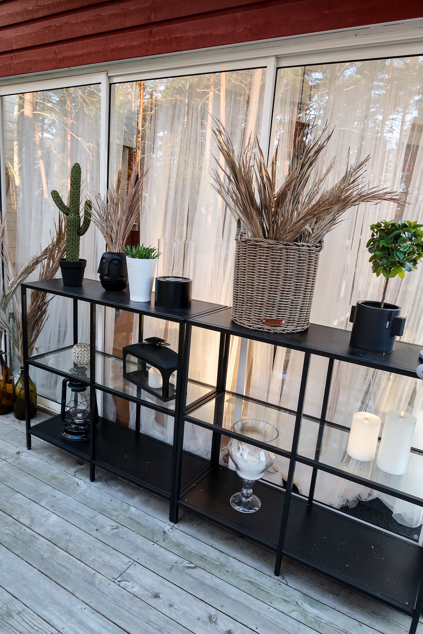 Ytterligare ett litet mysställe som jag gjort i ordning. I den svarta hyllan ska vi ha handdukar och sånt till bubbelkoppen. Ska bara köpa en bra korg med lock till det, ska eventuellt plasta in den sen för att kunna ha den ute även om det regnar. Dessutom står hyllorna en bit innanför taket.