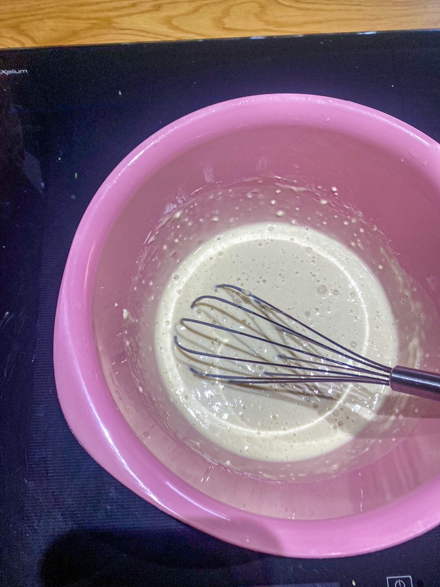 3) Smält smöret i en stekpanna och vispa ner det i smeten.