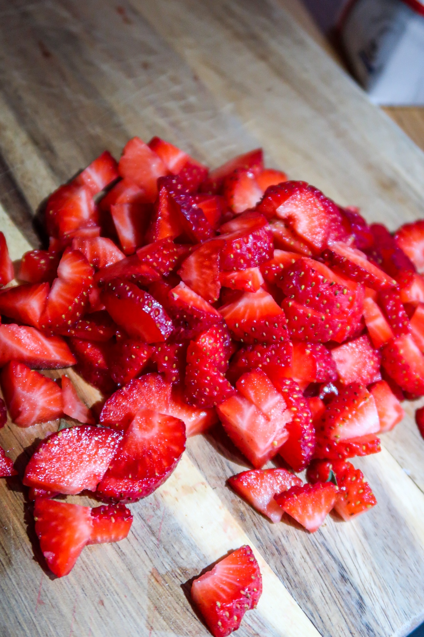 5) Vispa grädden. Ha i marmeladen, vispa lite. Hacka jordgubbar och basilika och ha i det, avsluta med vaniljsocker. Rör runt med slickepott.