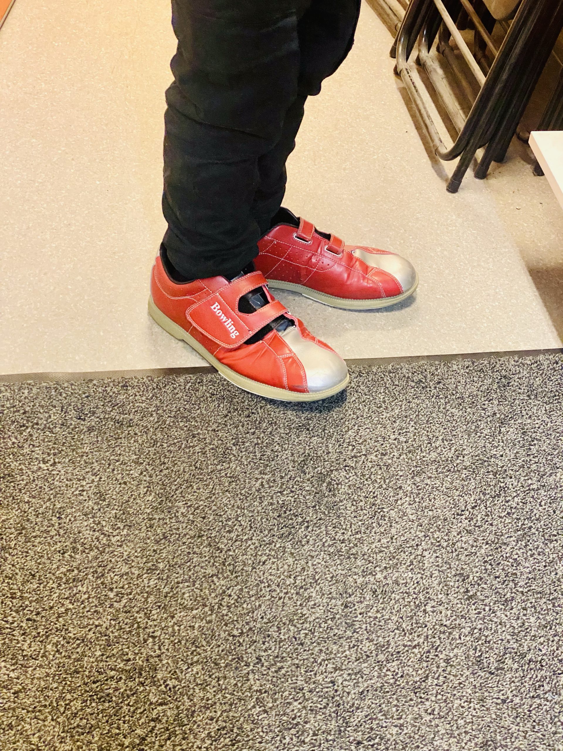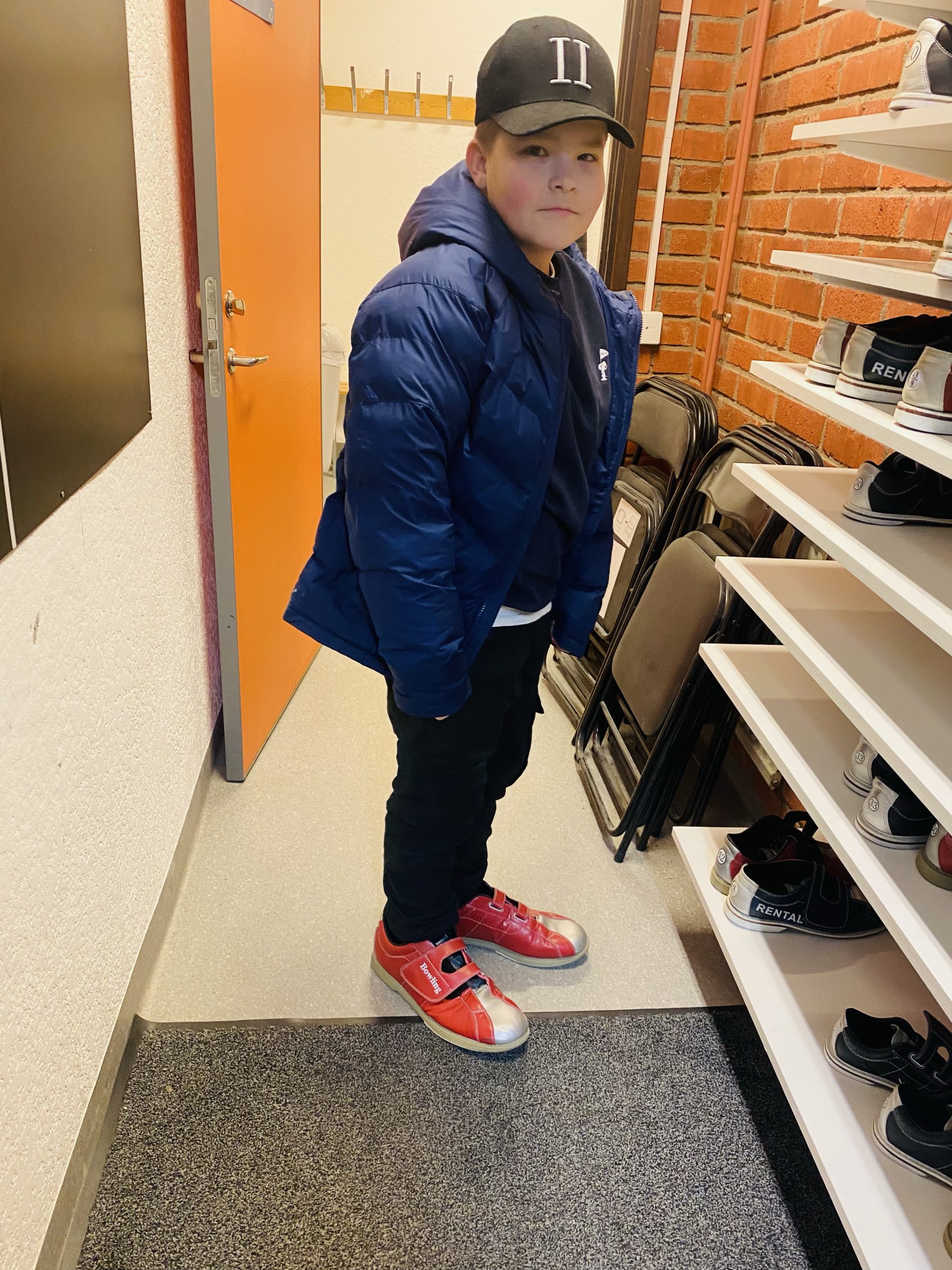 Det fanns inga storlekar kvar av bowlingskorns så snacka om att vi fick oss ett gott skratt när Milo stövlade på sig storlek 50 på bowlingskorna.